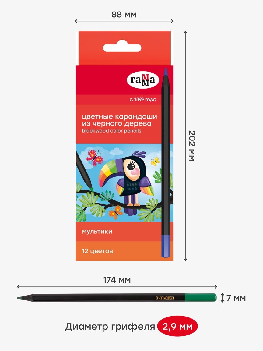 Карандаши цветные 12 цветов Гамма "Мультики" (L=174мм, D=7мм, 6гр, черное дерево) картон. упак., европодвес (80220221), 12 уп.