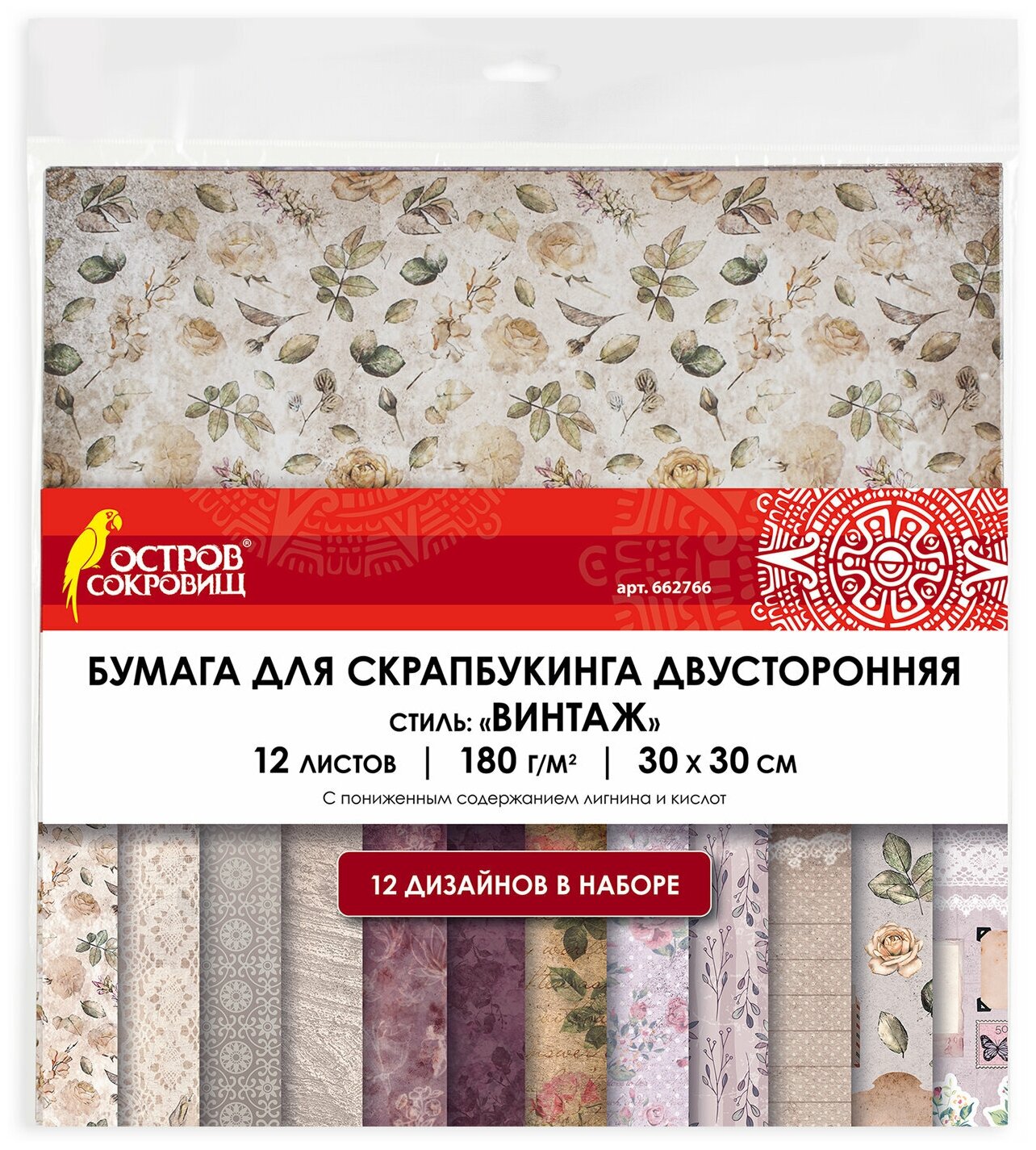 Бумага для скрапбукинга 30х30 см "Винтаж", двусторонняя, 12 листов, 12 дизайнов, 180 г/м2, остров сокровищ, 662766, 662766