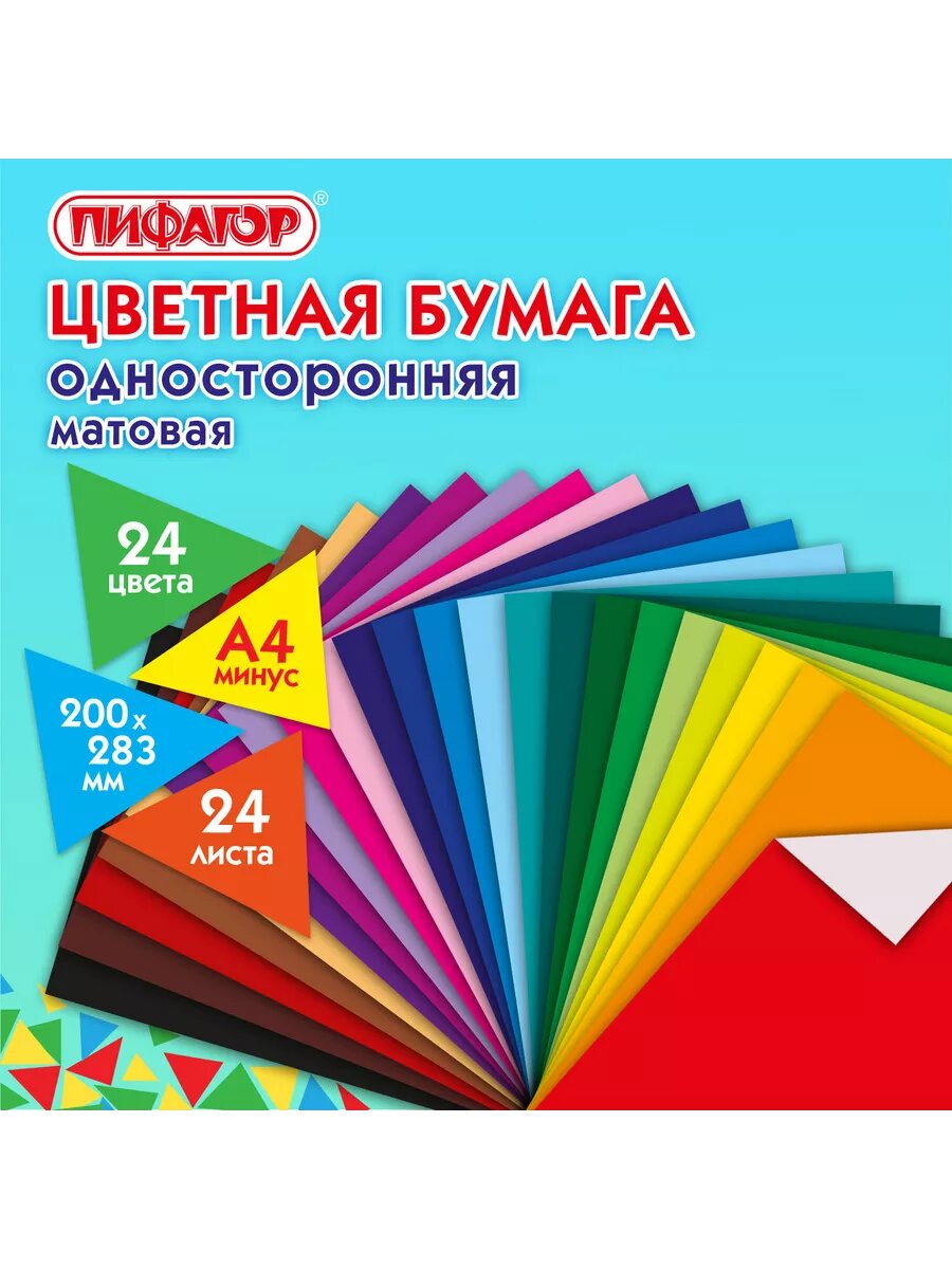 Купить Цветная бумага пифагор, для творчества, односторонняя, формат А4, 24 цвета, 24 листа, 5 штук