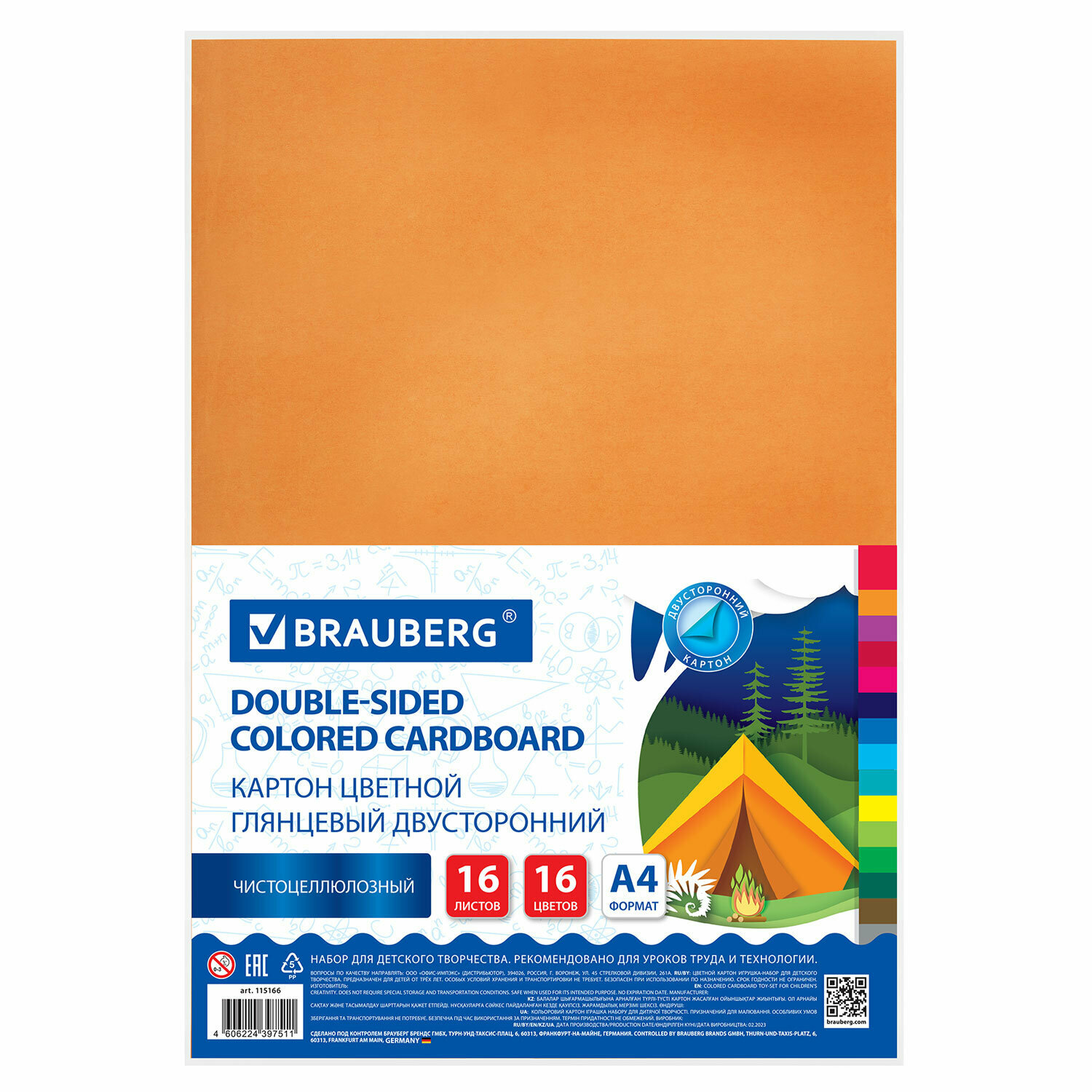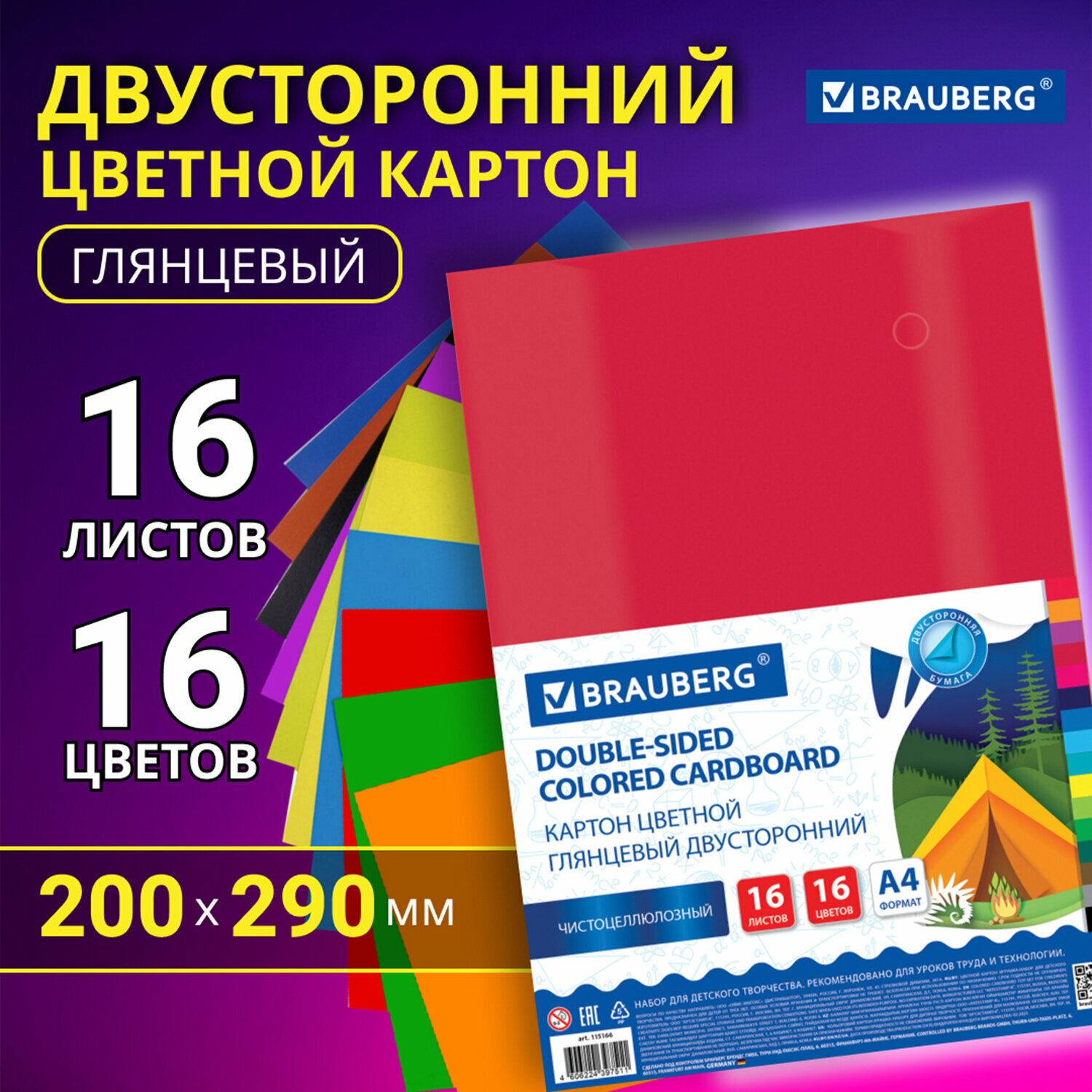 Купить Цветной картон Brauberg А4, 2-сторонний, мелованный Extra, 16 листов, 16 цветов, 200х290 мм