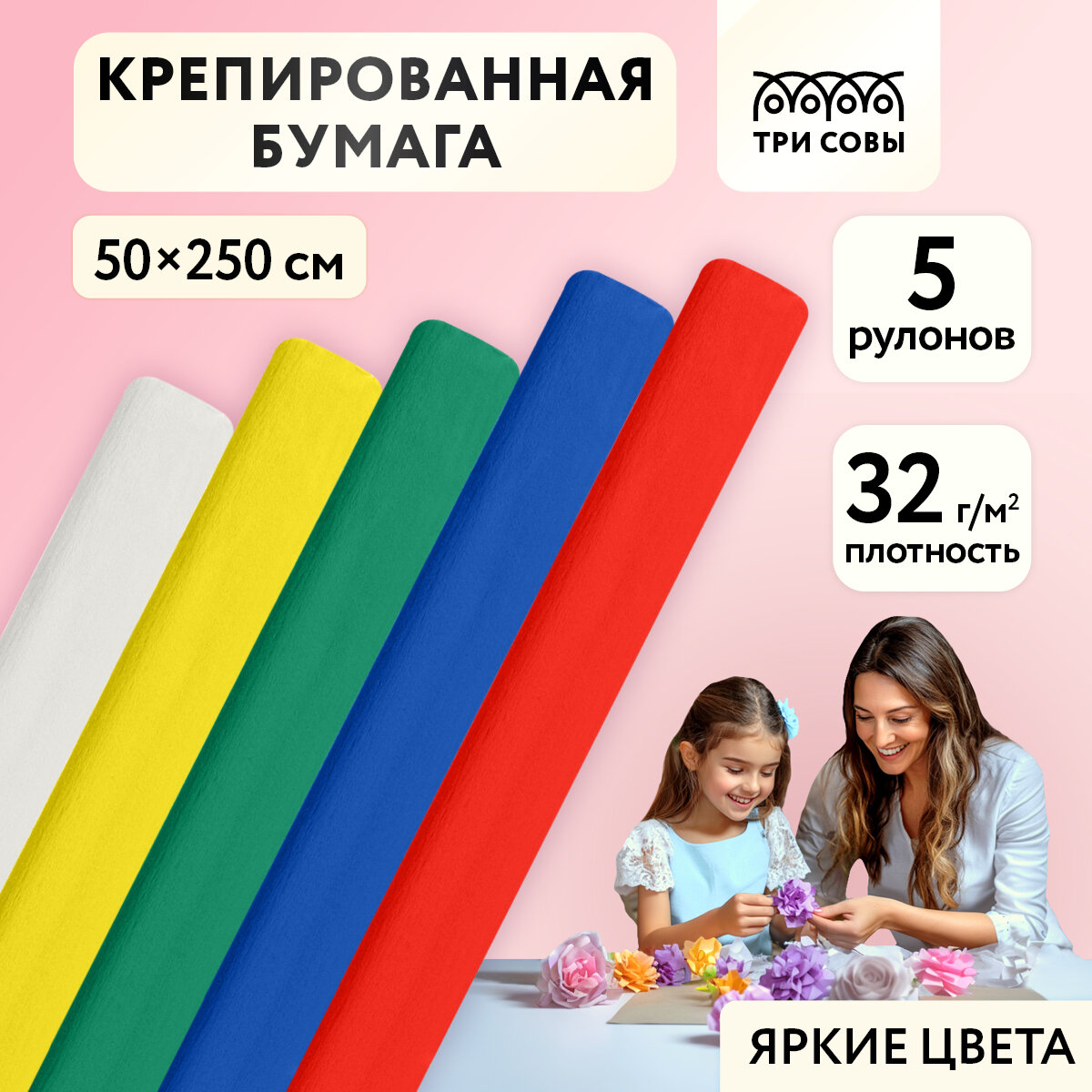 Набор крепированной бумаги ТРИ совы 5 шт, 50х250 см, 32 г/м2, в рулонах (CR_44012) интересное: