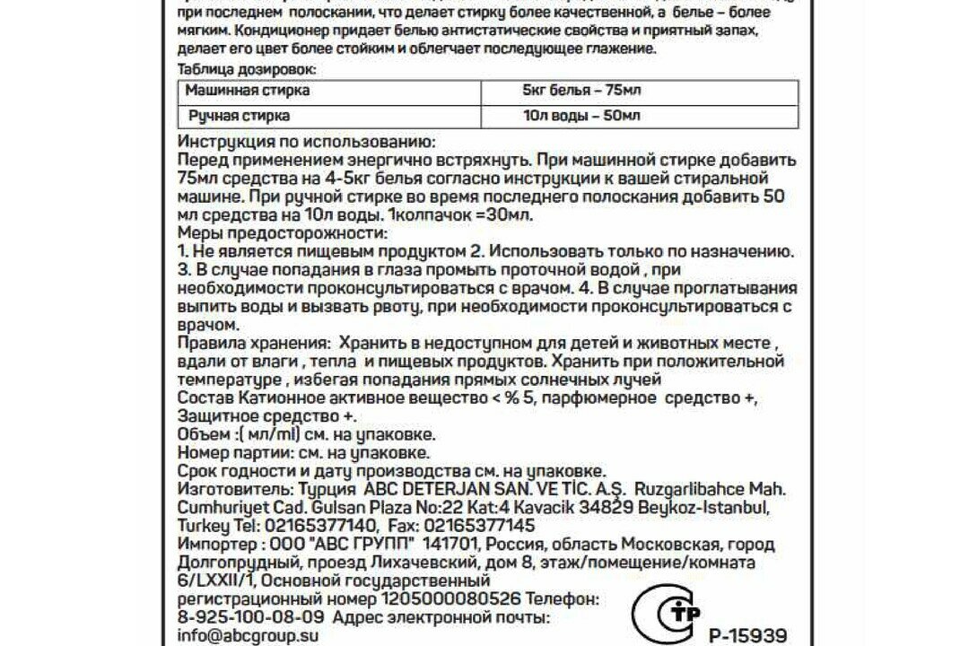 | Способ применения | перед применением энергично встряхнуть. После стирки обычным порошком добавьте кондиционер в воду для последнего полоскания белья. Для лучшего результата не полощите белье после использования кондиционера. Для ручной стирки и стиральных машин активаторного типа: добавьте 2/3 колпачка в 10–15л воды, опустите белье в раствор, отожмите и высушите. Для автоматических стиральных машин добавьте 1 колпачок во время последнего полоскания белья |
