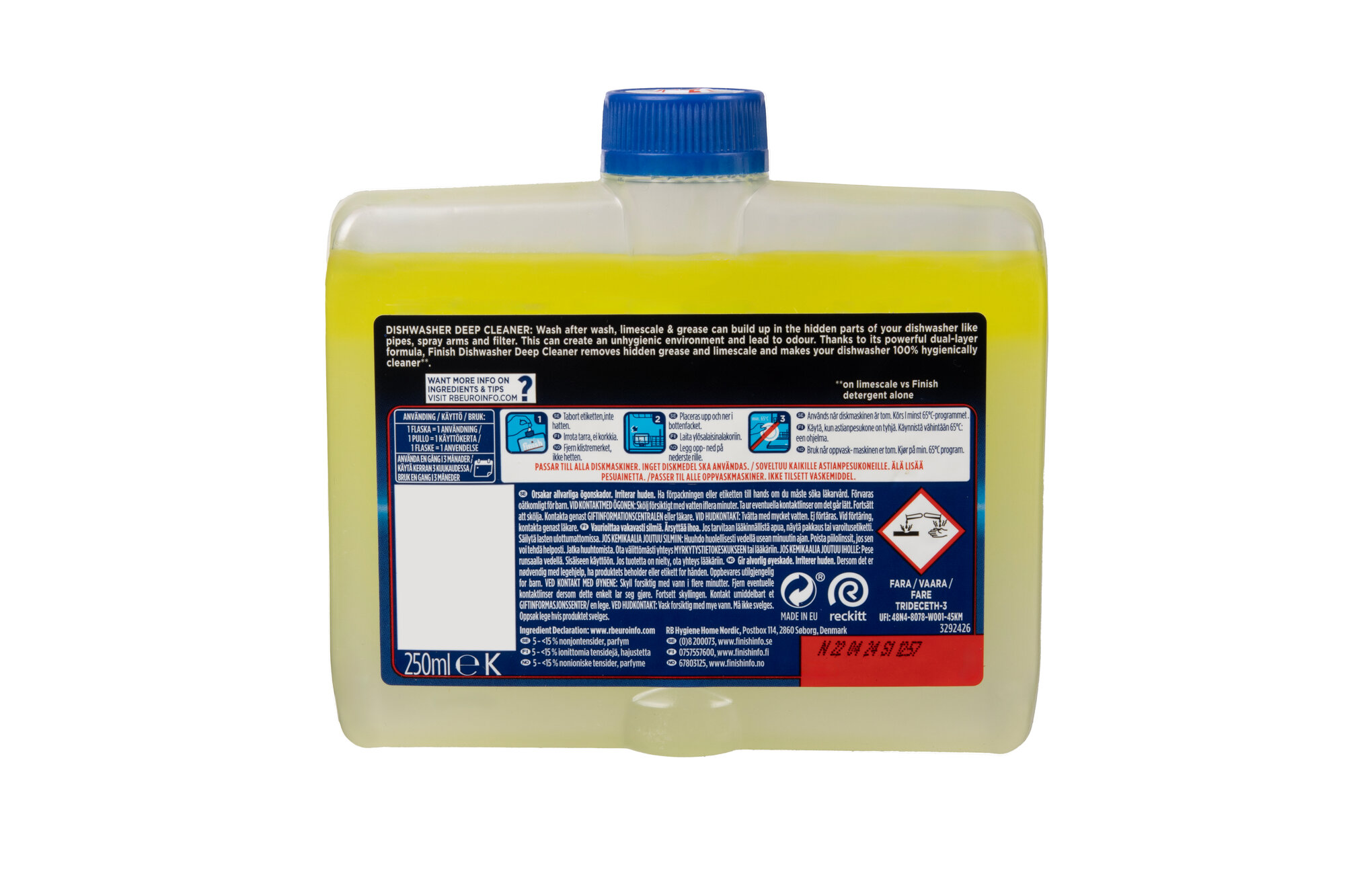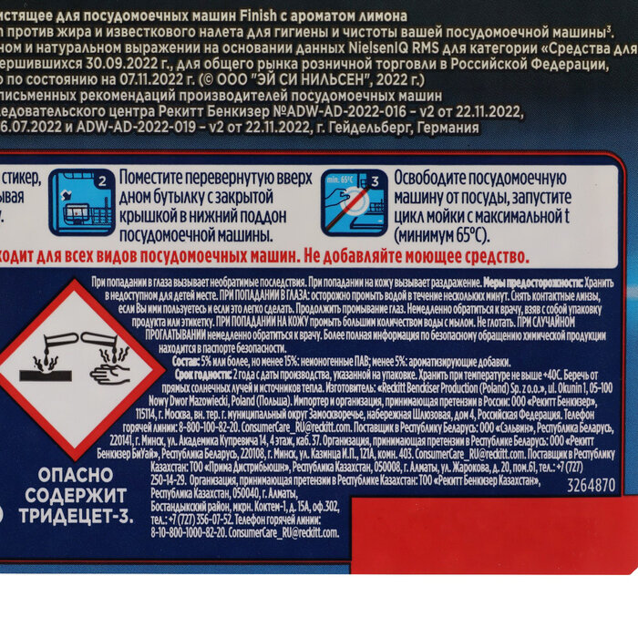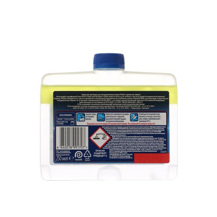 | Дополнительная информация | применение: снимите наклейку с колпачка бутылки с очистителем для посудомоечных машин. Не снимайте колпачок. Поставьте перевернутую вверх дном бутылку в корзинку для столовых приборов или любое нижнее отделение для тарелок. Закройте посудомоечную машину и запустите высокотемпературный цикл при минимум 60⁰C. Не добавляйте другие моющие или чистящие средства. После завершения полного цикла откройте посудомоечную машину, извлеките бутылку и утилизируйте ее. В случае сильных загрязнений, возможно, процедуру придется повторить |