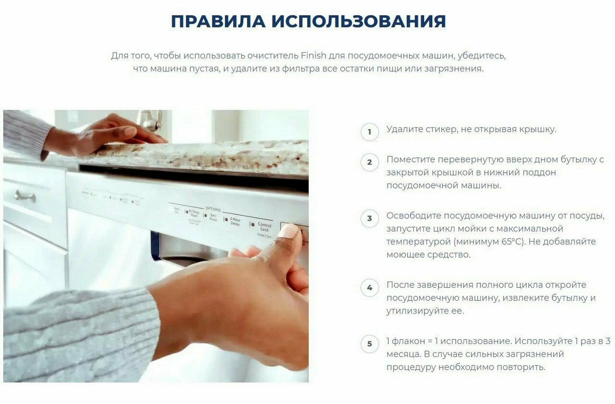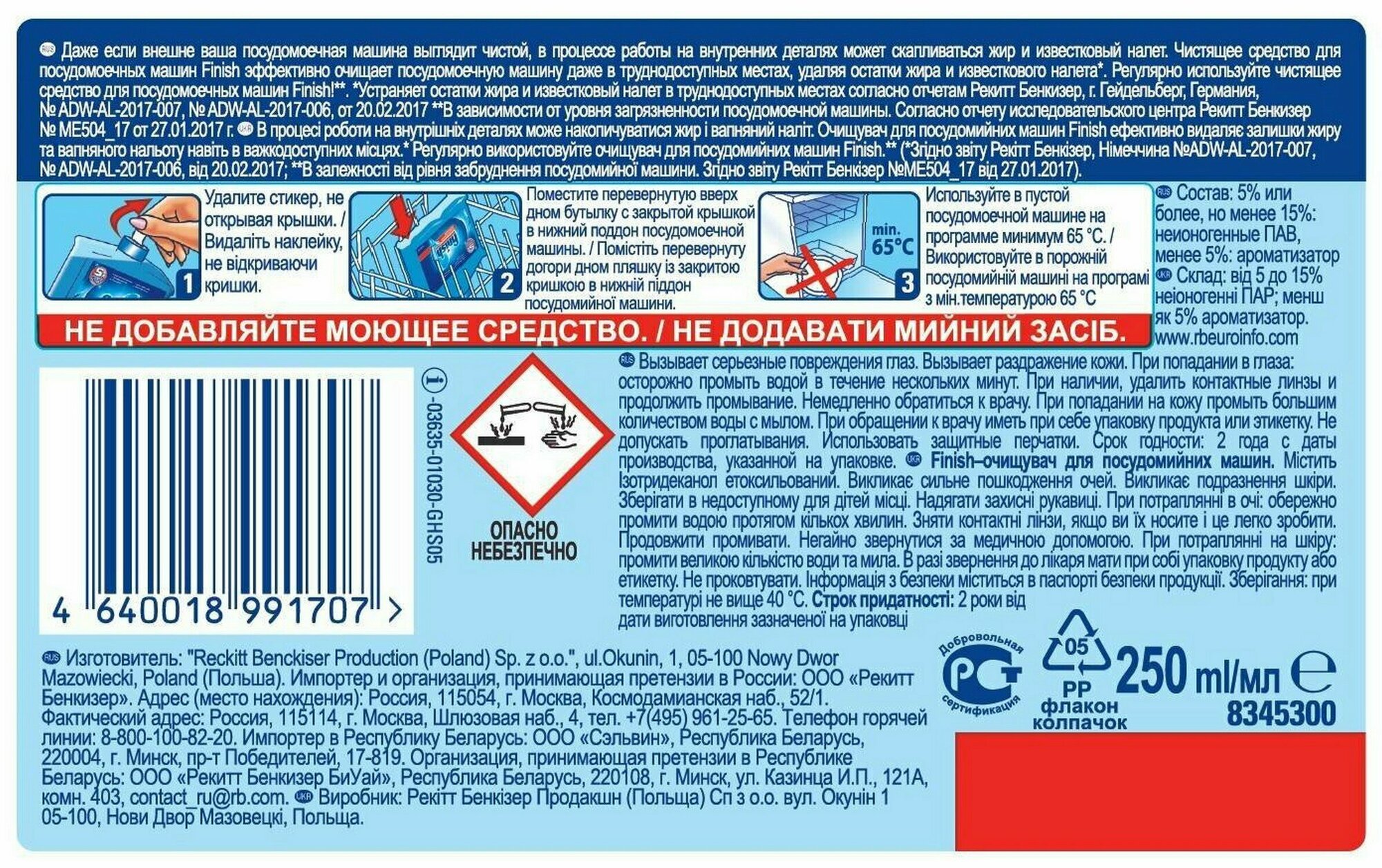 | Дополнительная информация | применение: снимите наклейку с колпачка бутылки с очистителем для посудомоечных машин. Не снимайте колпачок. Поставьте перевернутую вверх дном бутылку в корзинку для столовых приборов или любое нижнее отделение для тарелок. Закройте посудомоечную машину и запустите высокотемпературный цикл при минимум 60⁰C. Не добавляйте другие моющие или чистящие средства. После завершения полного цикла откройте посудомоечную машину, извлеките бутылку и утилизируйте ее. В случае сильных загрязнений, возможно, процедуру придется повторить |