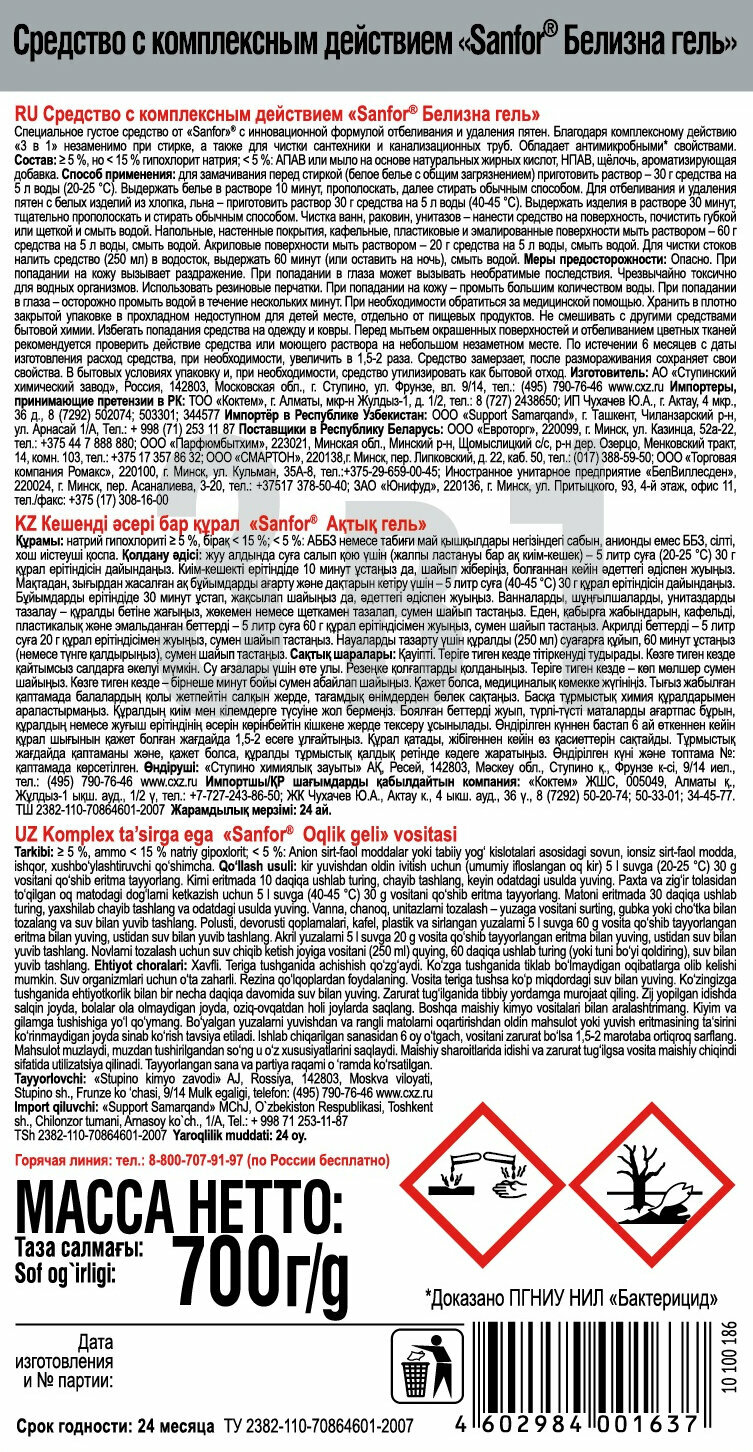 SANFOR Пятновыводитель и отбеливатель Белизна-гель 3 в 1 с хлором 700мл