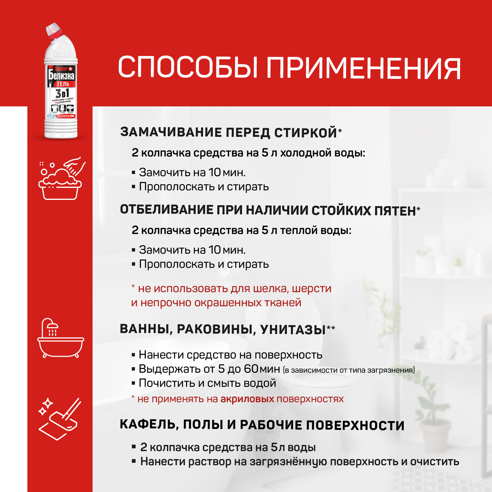 | Содержит | ПАВ / гидроксид натрия / гипохлорит натрия / кислоты / отбеливатель / соль ЭДТА / хлор / щелочь |
