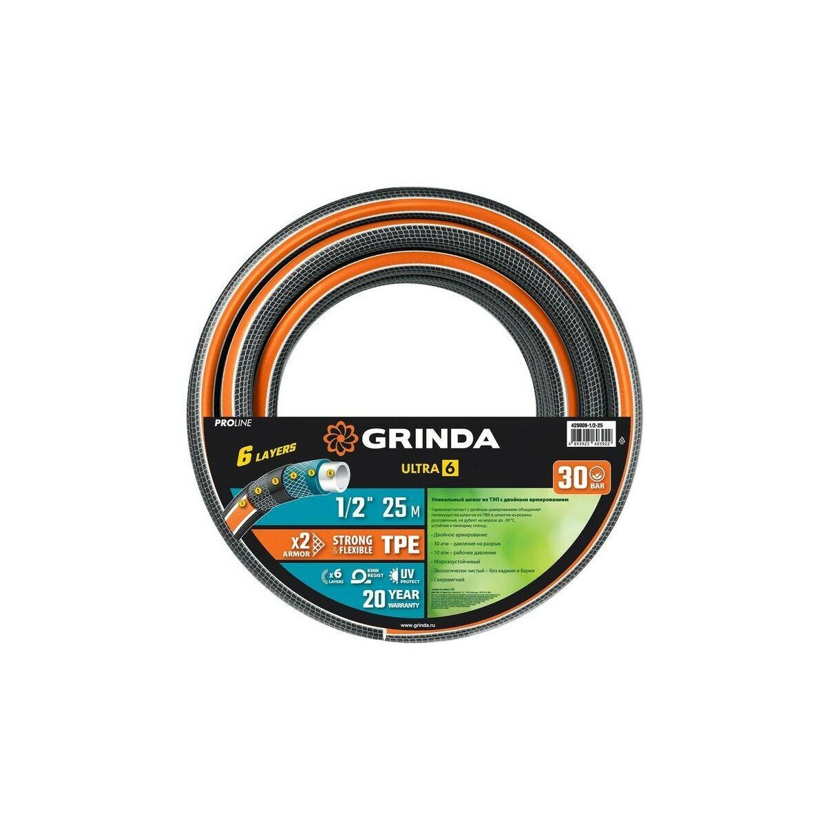 Поливочный шланг GRINDA ULTRA 6, 1/2, 25 м, 30 атм, шестислойный, двойное армирование, PROLine (429009-1/2-25)
