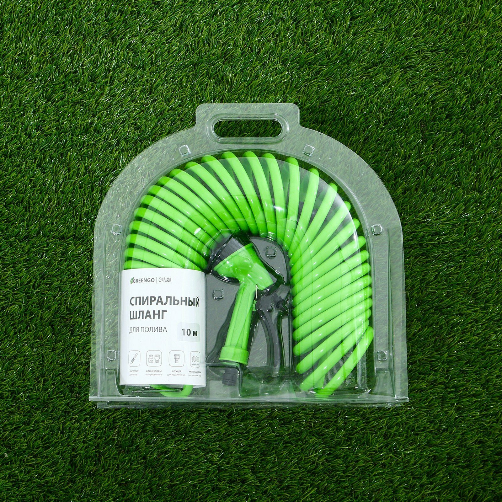 Шланг поливочный спиральный, 10 м, быстросъёмный, с поливочным пистолетом и штуцером, зелёный, Greengo