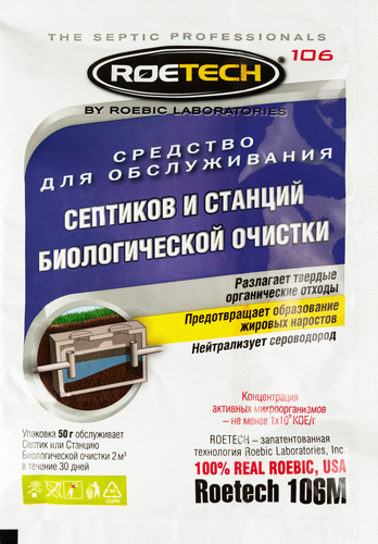 | Дополнительная информация | Средство для септиков и станций биологической очистки Roetech 106М, 50г |
