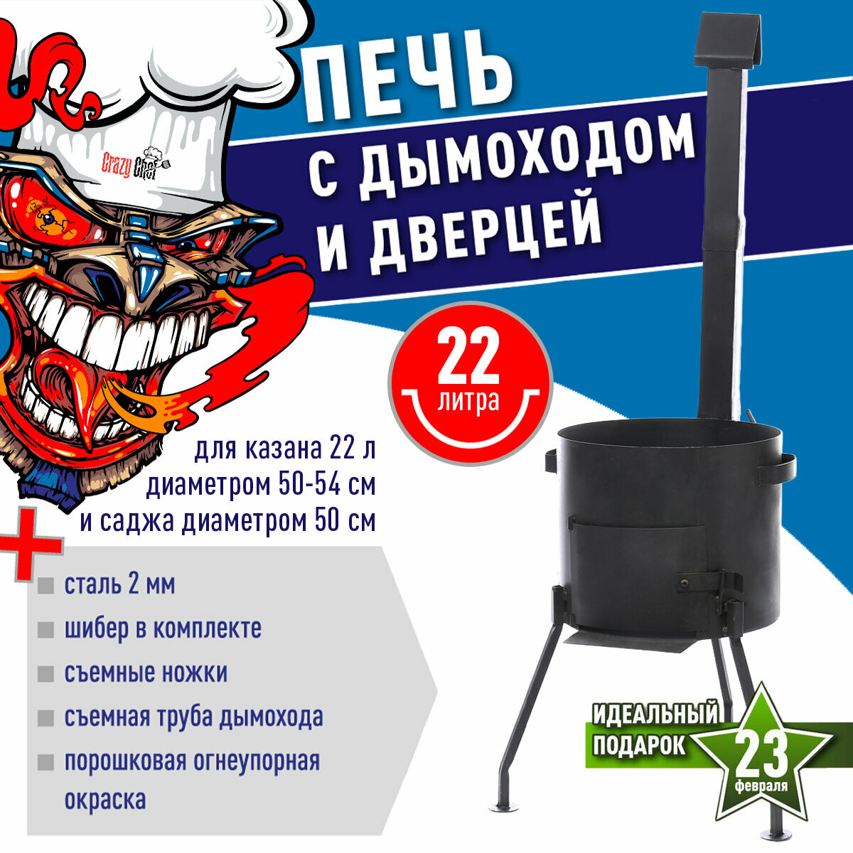 Печь для казана 16 л, диаметр 40 см, сталь 2 мм, с трубой и дверцей, съемные ножки