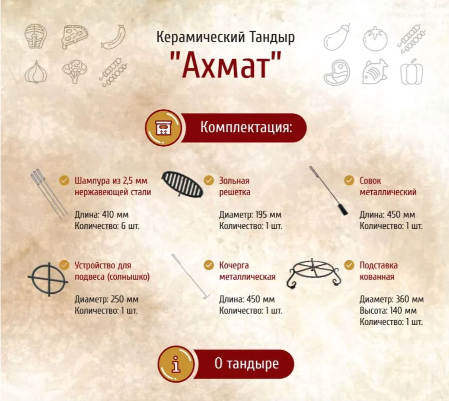 | Дополнительная информация | комплектация: 6 шампуров, совок, кочерга, зольная решетка, устройство для подвеса (солнышко), кованная подставка |
