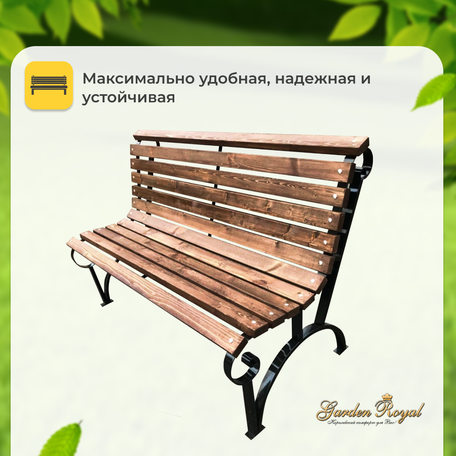 Скамейка садовая Классика с деревянными спинкой и сиденьем без покраски, лавочка для дачи с металлическим каркасом