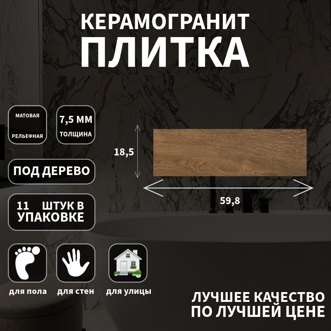 Керамогранит Cersanit, Sherwood коричневый рельеф, поверхность: матовая, 18,5х59.8х0.75 см интересное: