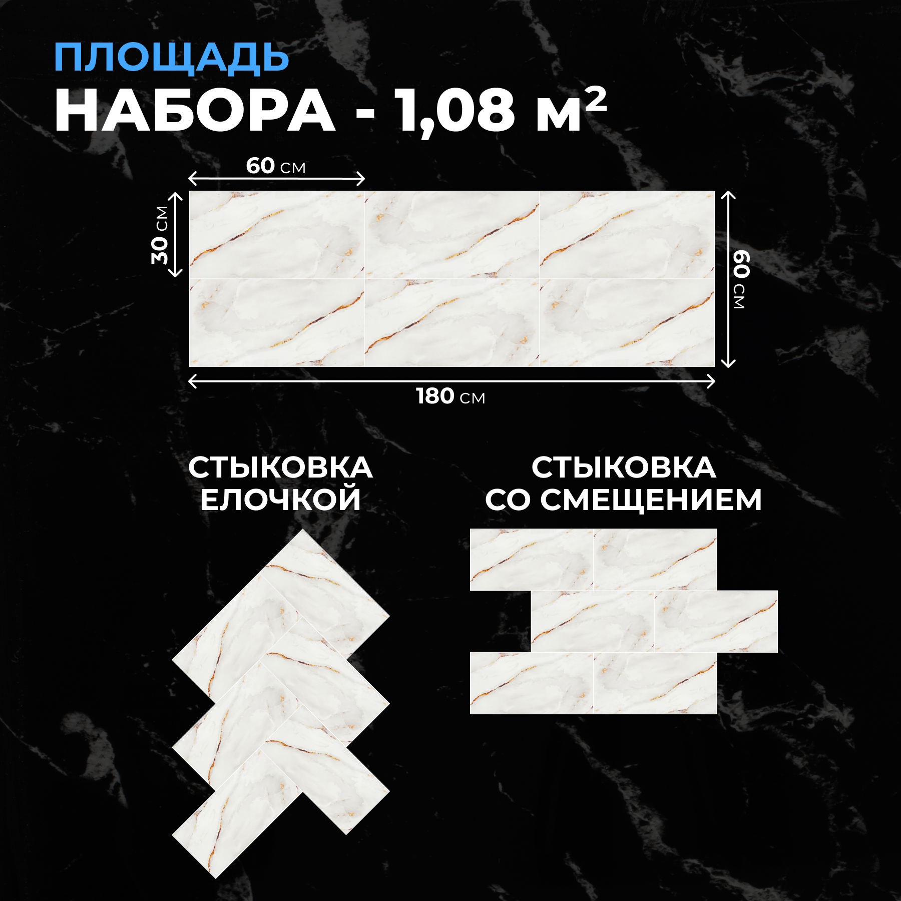 Черный мрамор, 60х30 см плитка глянцевая, самоклеющиеся панели для стен, декор для дома на кухню, в ванную (арт. 114) 18 шт.
