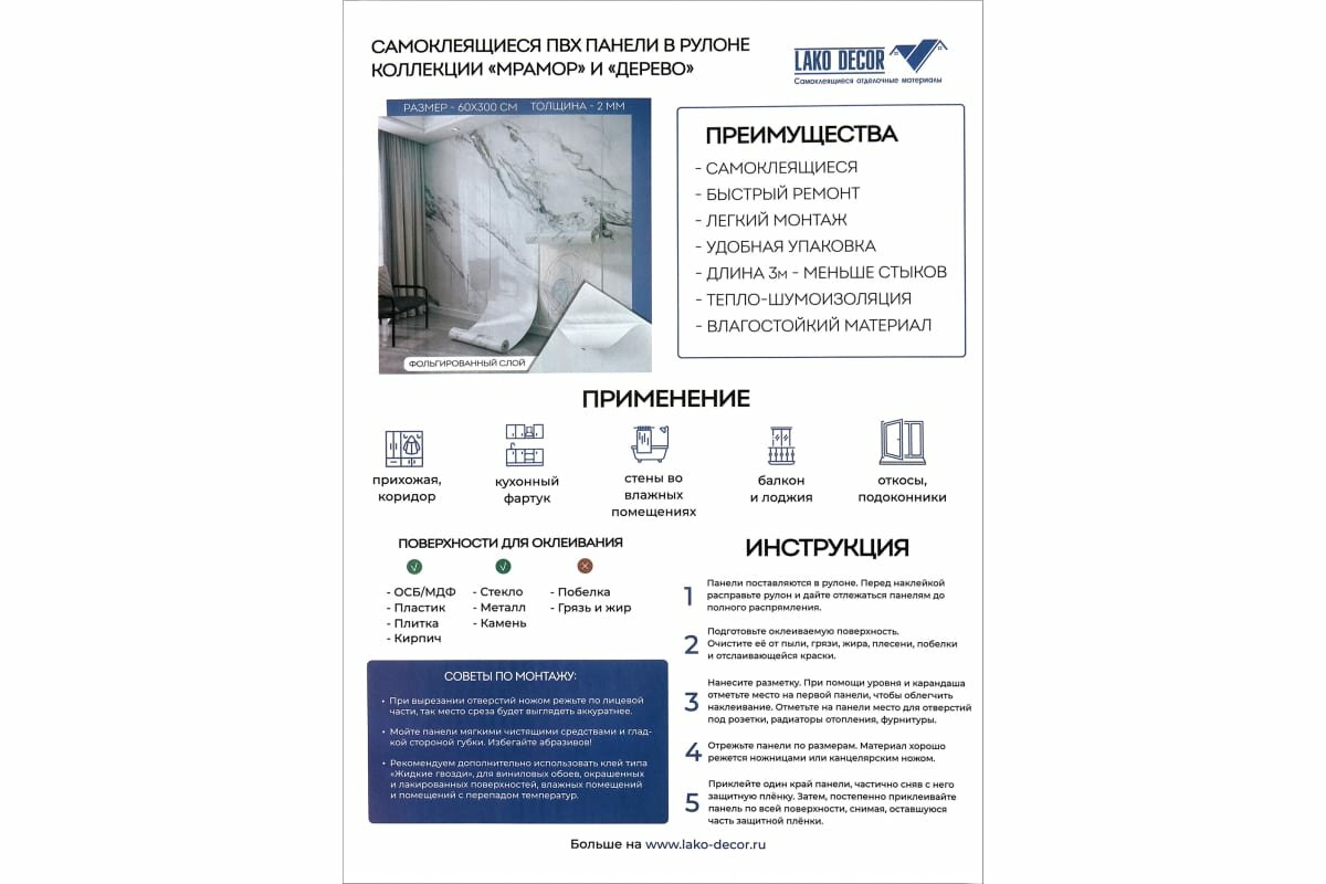 Самоклеящаяся ПВХ плитка рулон LAKO DECOR "Мрамор Бьянко" толщина 2мм 1,8м² 60х300 см