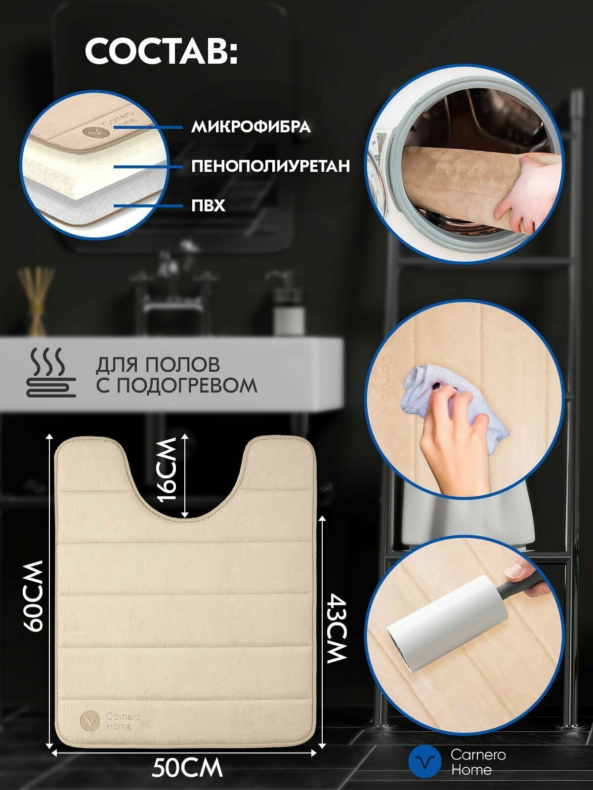 Купить Коврик в туалет Carnero, с вырезом под унитаз, противоскользящий, 50х60 см