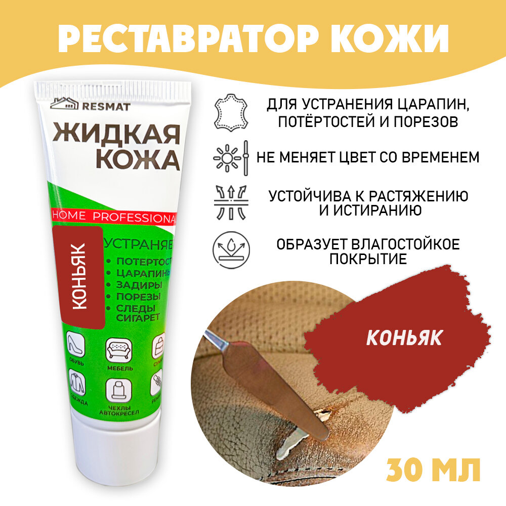 Жидкая кожа для мебели, одежды, восстановитель кожи Resmat 30 мл в тубе, "Коньяк"