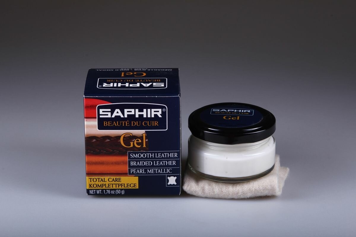 Гель Gel SAPHIR для всех видов гладких деликатных кож с перламутровым и оттенком "металлик", банка стекло с салфеткой, 50 мл. интересное: