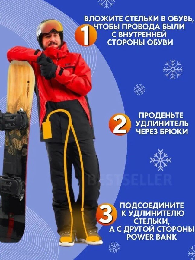 | Подробная комплектация | Стельки с подогревом, зимние стельки - 1пара; зарядный провод USB - 1шт; |