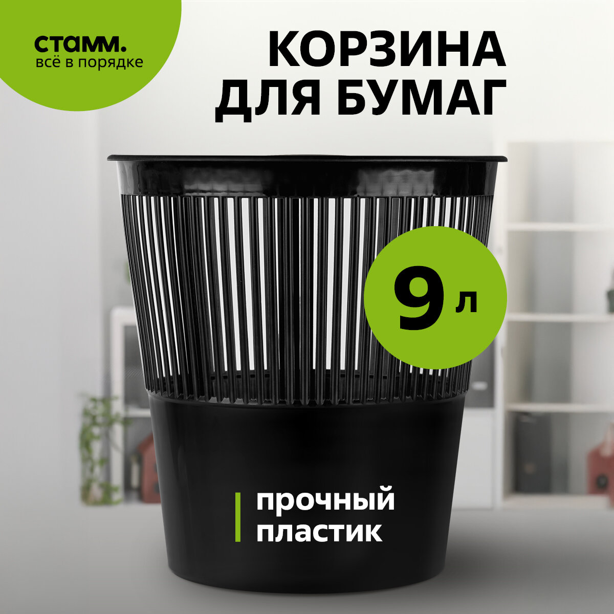 Корзина для мусора "Стамм" пластиковая офисная 9 литров черная / мусорное ведро для бумаг круглое сетчатое СТАММ