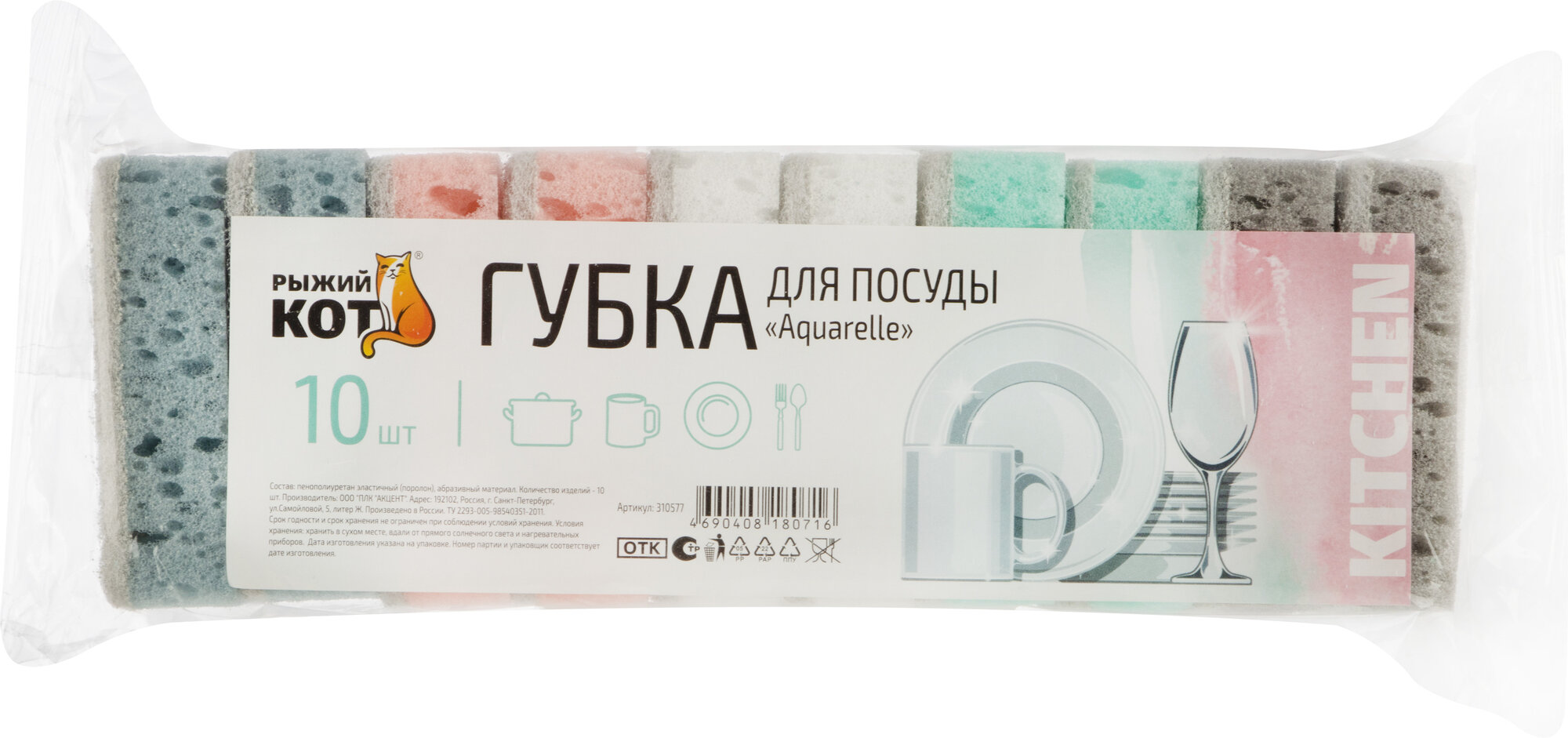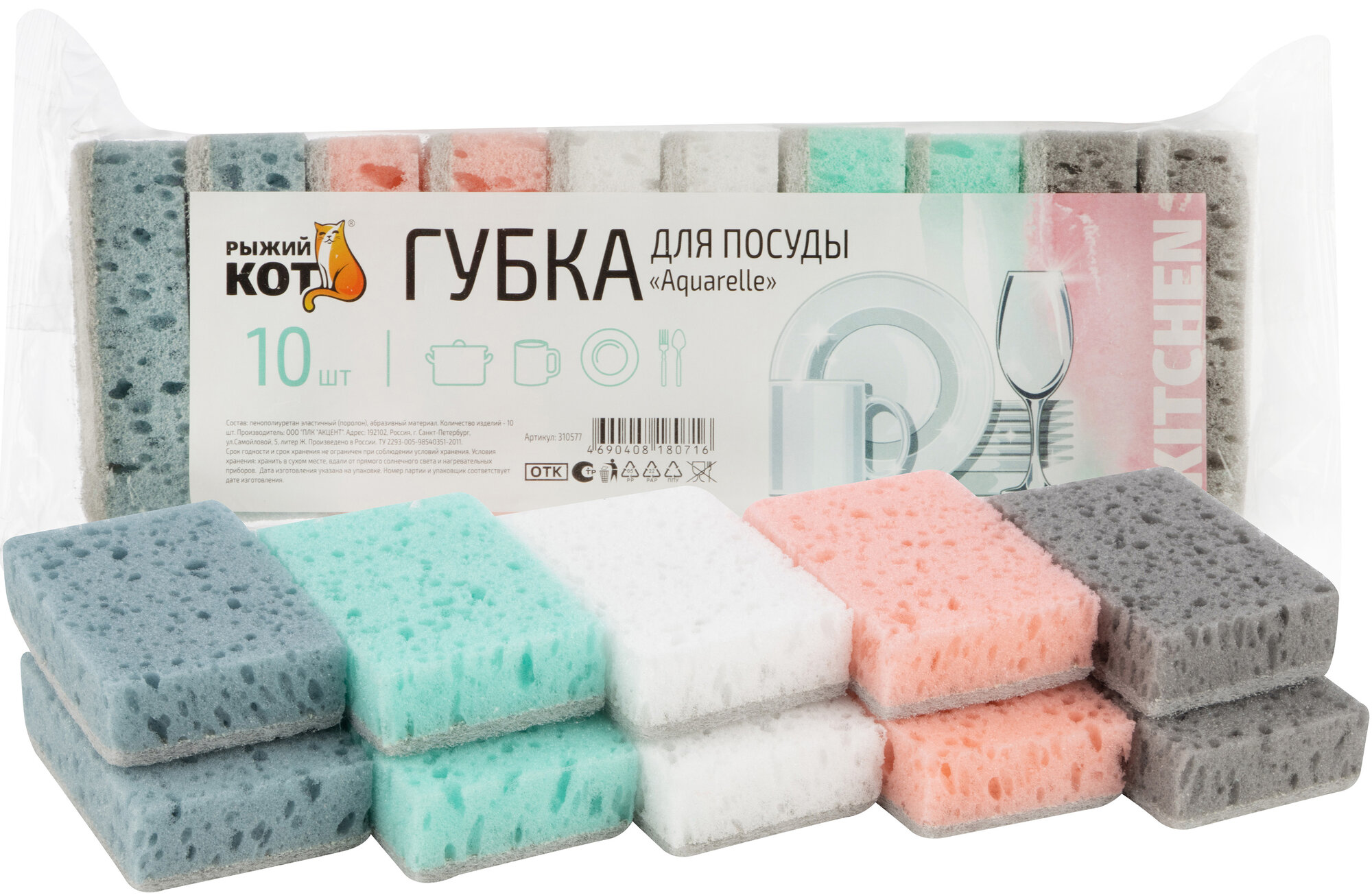Губки для мытья посуды "Рыжий Кот" Aquarelle, 10 штук, 9.3 x 6.5 x 2.7 см интересное: