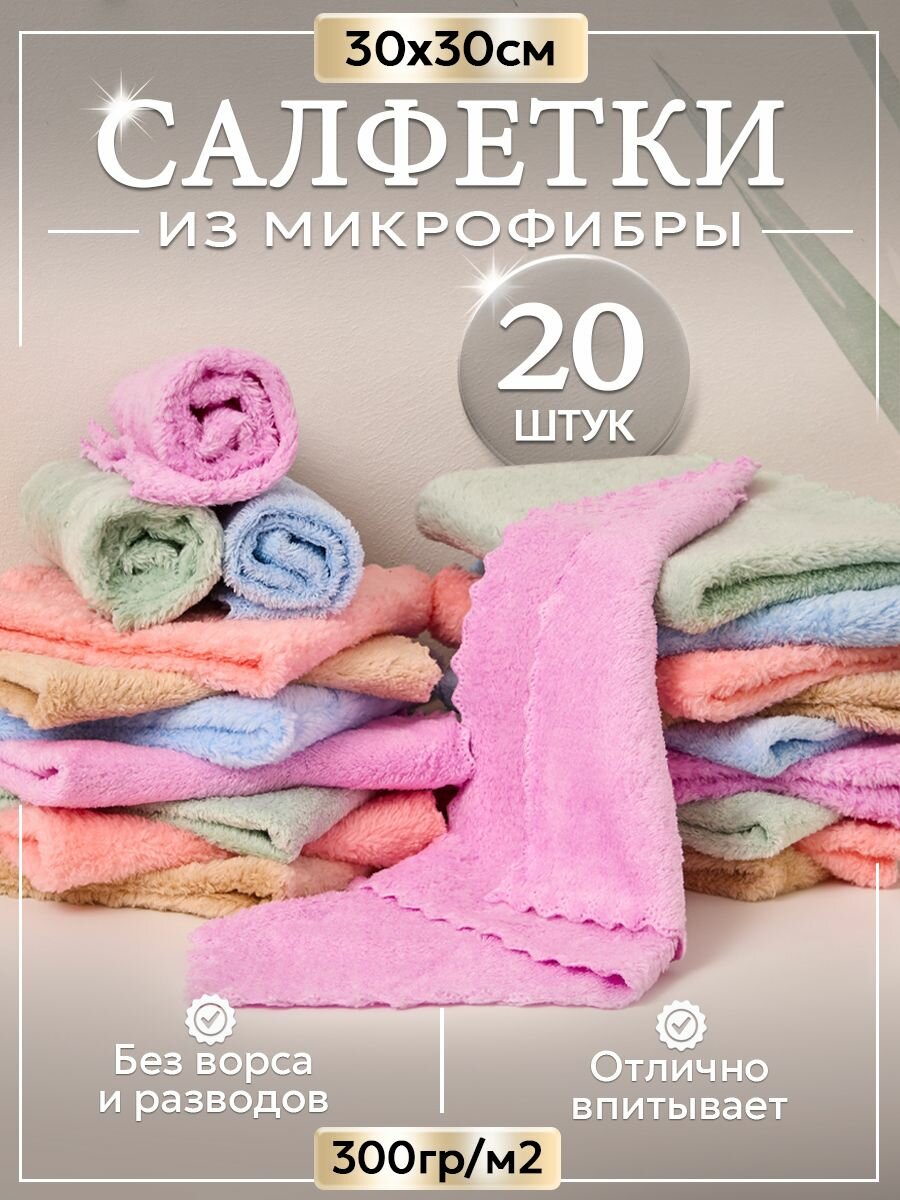 Салфетки для уборки из микрофибры цветные, 20 шт