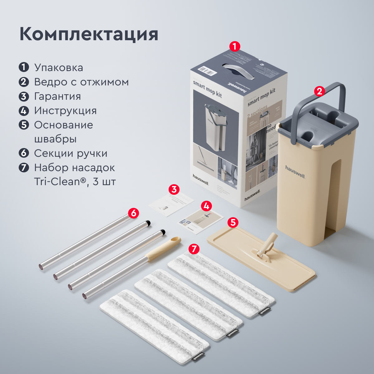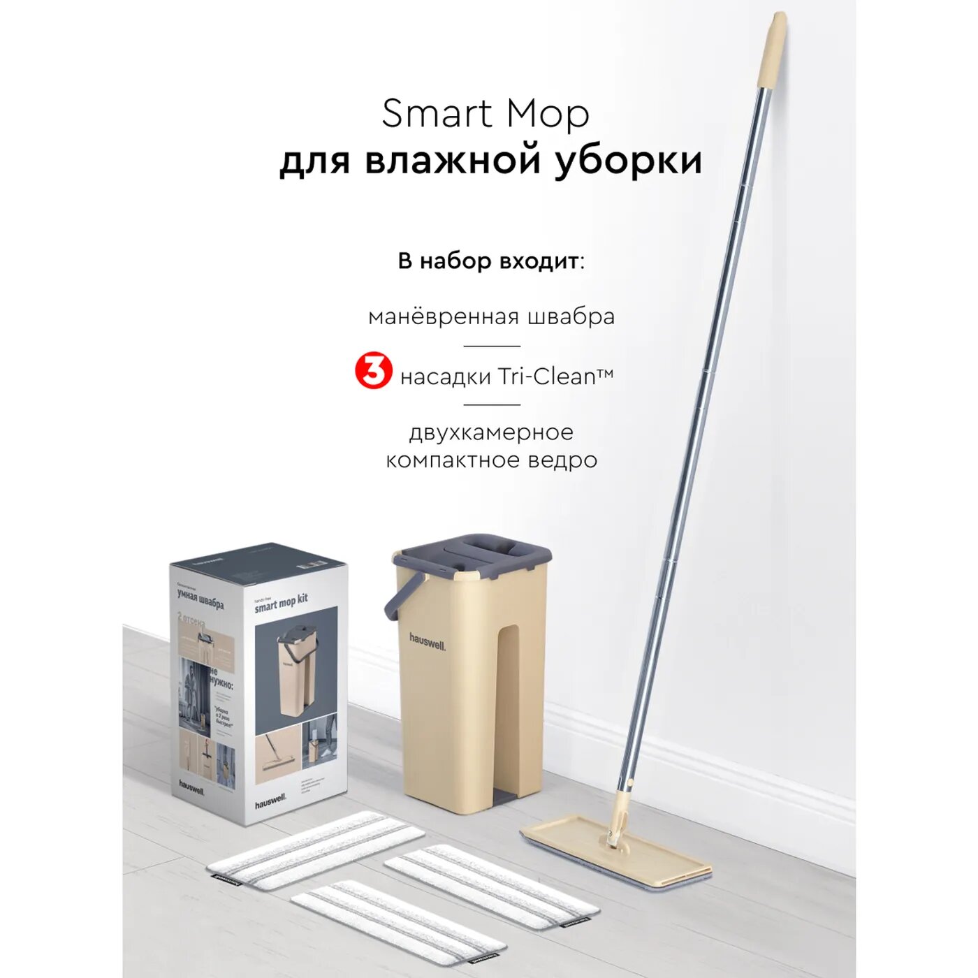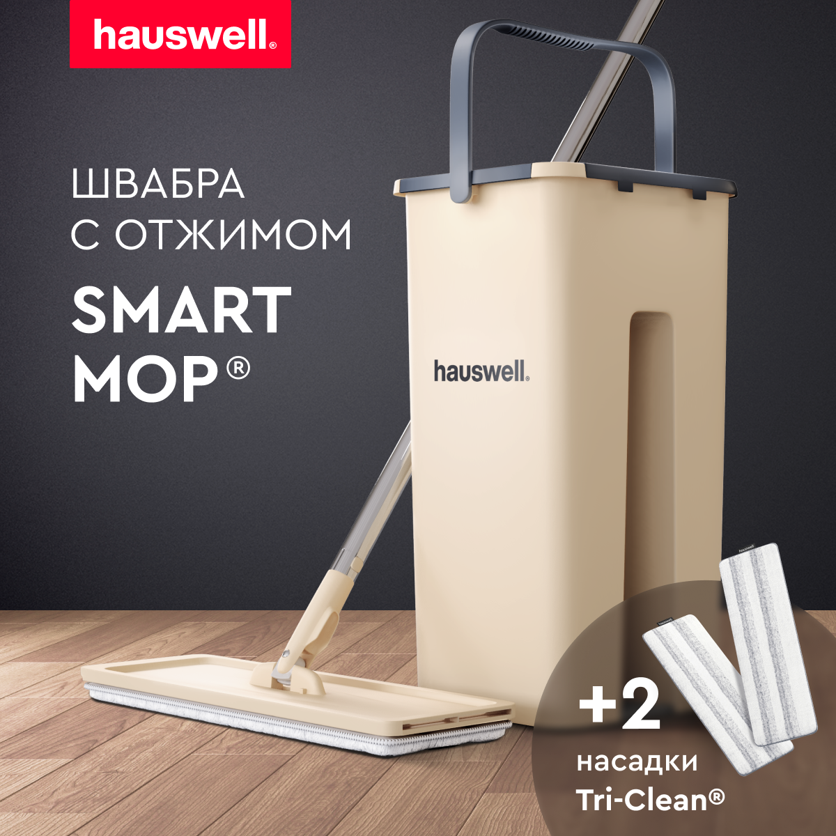 Швабра c отжимом и ведром на 7л Smart Mop Hauswell с 3 насадками, бежевый