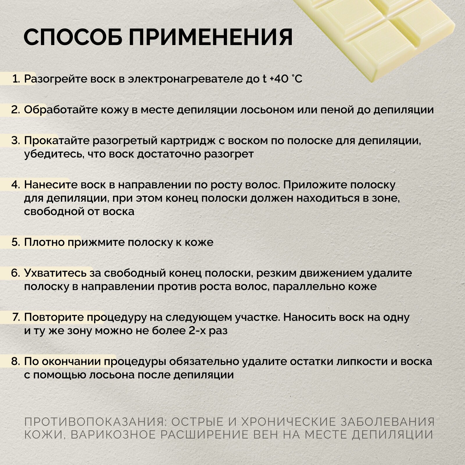 | Дополнительная информация | требуется использование бумаги для депиляции |