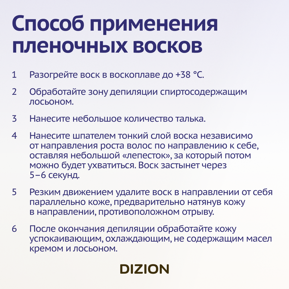 | Способ применения | разогреть воск до температуры 38°С на водяной бане или в воскоплаве. Обезжирить кожу и присыпать тальком. Распределить продукт тонким слоем с помощью шпателя по направлению роста волосков (при работе с интимной зоны - наносить по направлению к себе, удалять - от себя). Когда воск остынет и образуется плёнка (5-6 секунд), не используя полосок, придерживая и натягивая кожу одной рукой, другой удалить плёнку резким движением против роста волос. Повторить процедуру необходимое количество раз. После депиляции удалить остатки средства косметической водой. Нанести средство после депиляции |