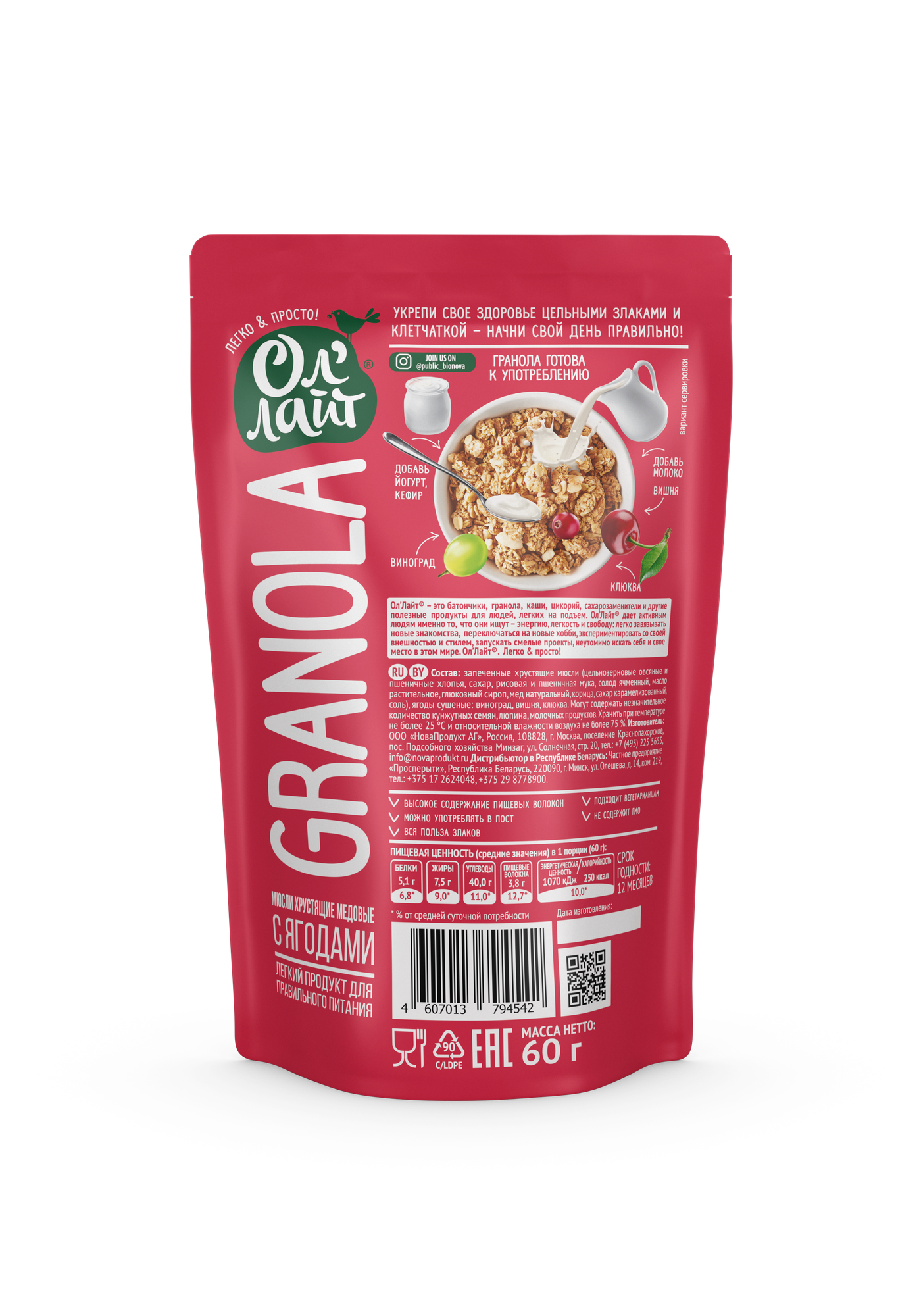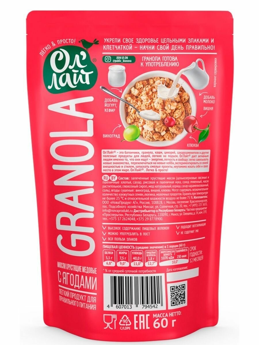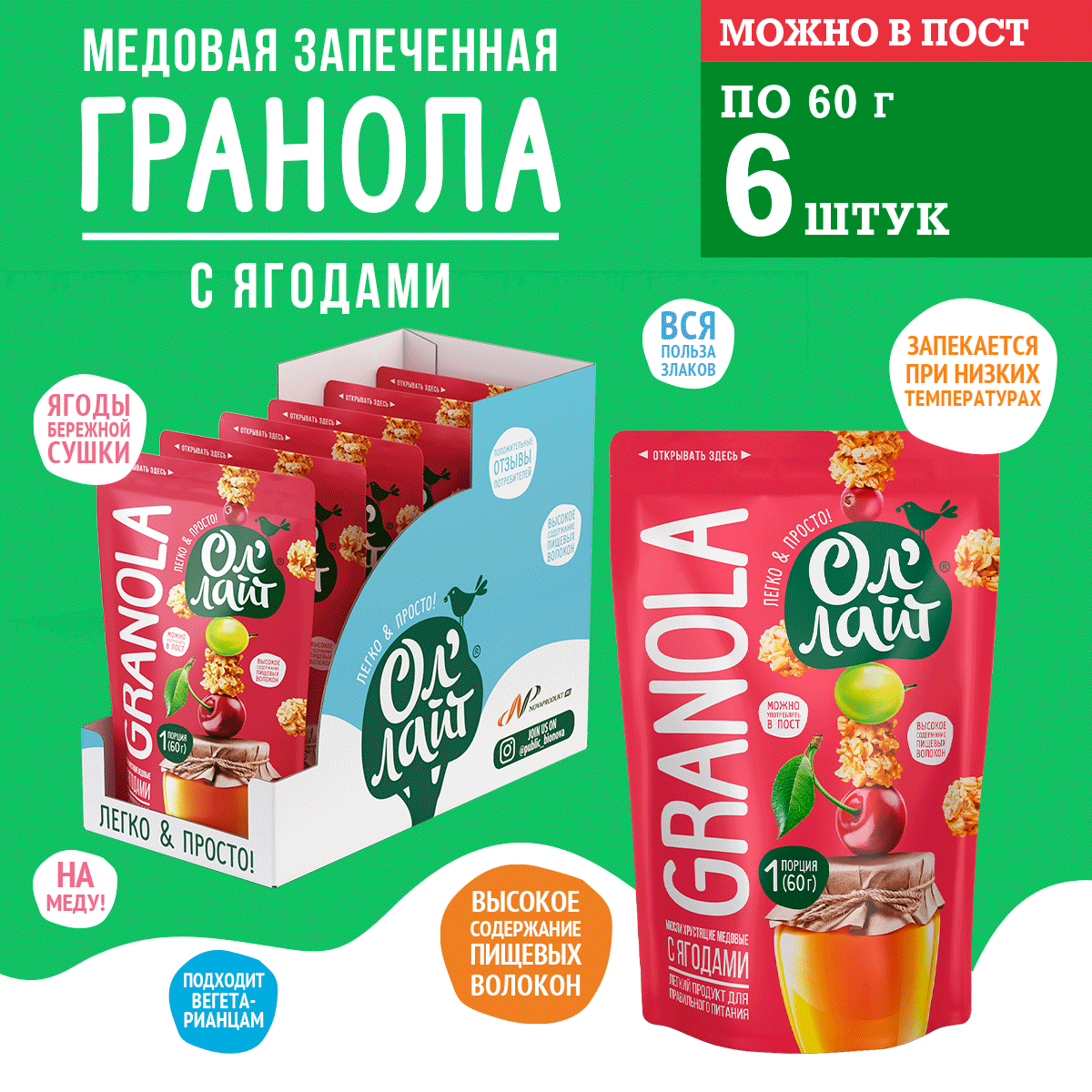 Купить Мюсли Гранола запечённые "Ол'Лайт" медовые с ягодами 6шт по 60г.