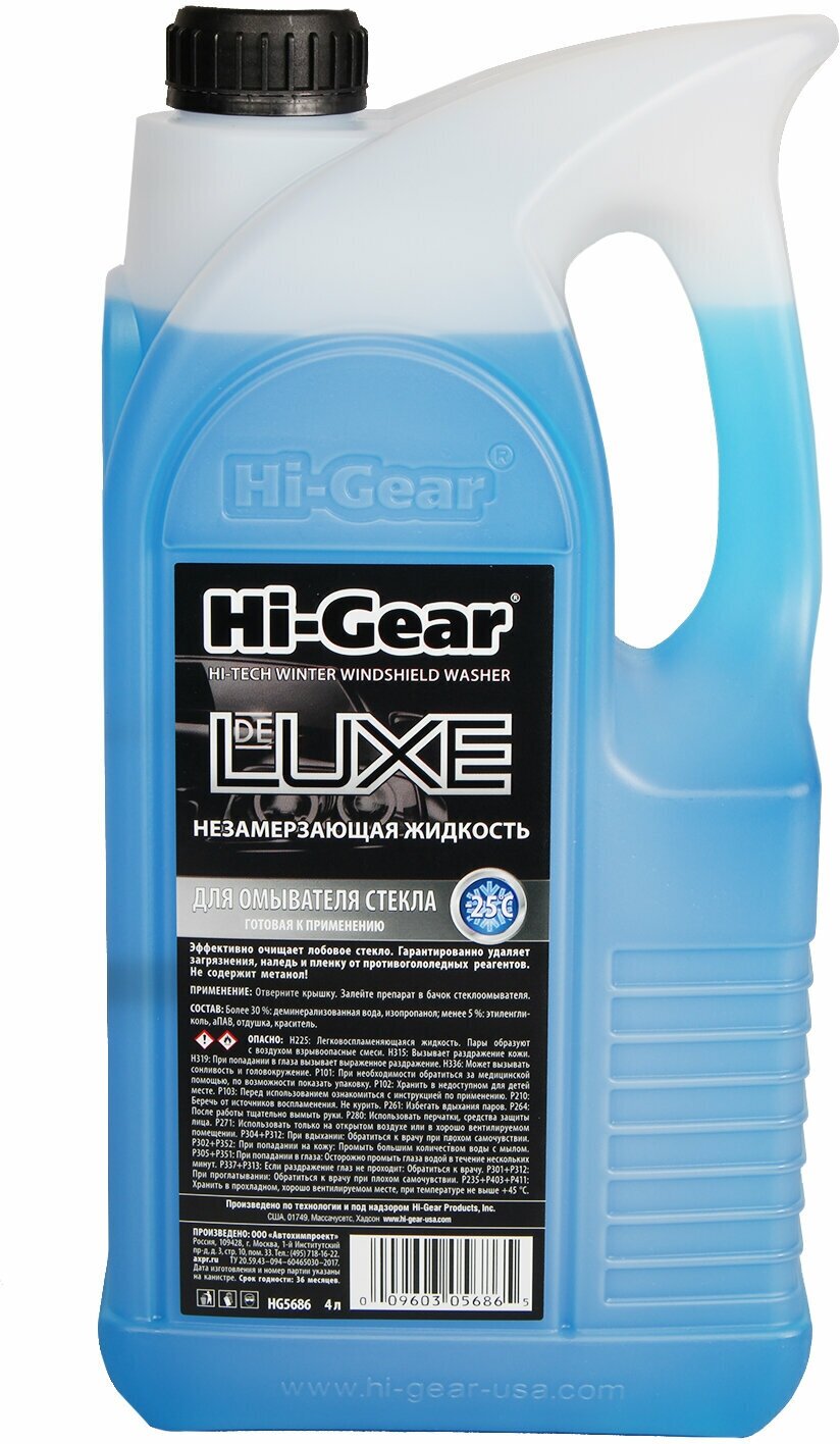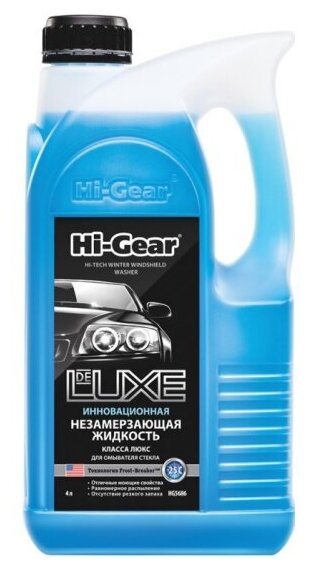 | Дополнительная информация | Незамерзающая жидкость Hi-Gear DeLuxe, созданная по технологии Frost-Breaker™, содержит депрессор температуры Qlant-25, который обеспечивает стабильные свойства и высокую эффективность жидкости, а также ее равномерное разбрызгивание через форсунки при низких температурах. Качественно устраняет грязь, дорожные реагенты и другие трудноудаляемые загрязнения. Растворяет ледяную корку и снег. Не образует наледь и белесый налет. Облегчает скольжение щеток стеклоочистителя, продлевая срок их службы. Придает поверхности грязе-,водоотталкивающие и антиобледенительные свойства. |