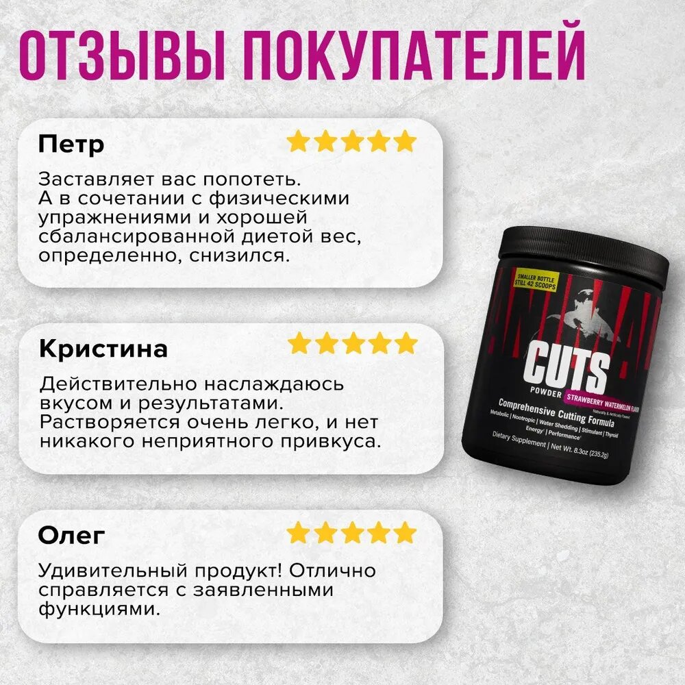 Ниже Вы можете прочитать отзывы на Комплекс для жиросжигания Animal Cuts Powder, клубника-арбуз, 265 г, ознакомится с подробными характеристиками, посмотреть интересные обзоры и фотографии на Комплекс для жиросжигания Animal Cuts Powder, клубника-арбуз, 265 г.