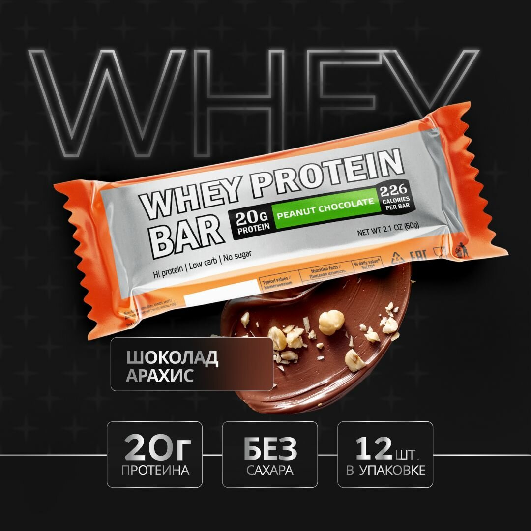 Купить Протеиновые батончики без сахара Whey Protein Bar Арахис и Шоколад, 12 штук по 60 г