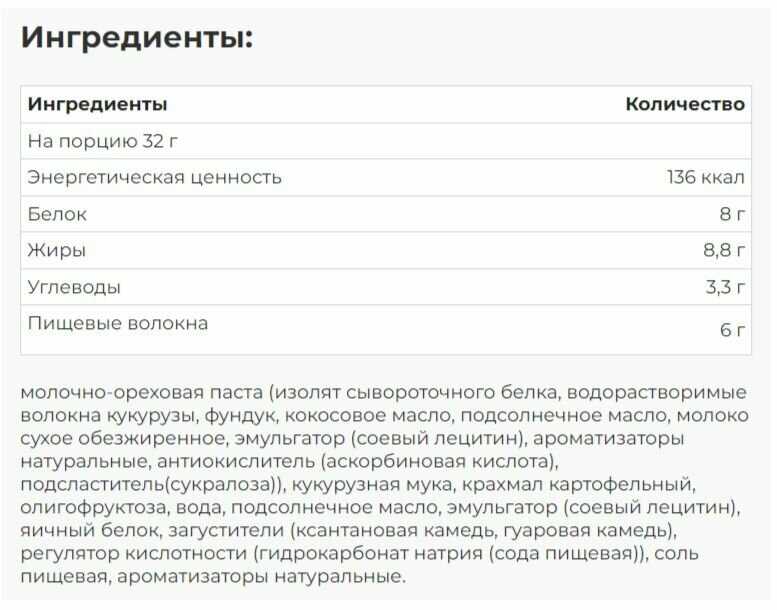 | Дополнительная информация | молочный шоколад (водорастворимые волокна кукурузы, какао масло, какао тертое, молоко сухое обезжиренное, эмульгатор(соевый лецитин), ароматизаторы натуральные, подсластитель(сукралоза)), концентрат сывороточного белка, масло кокосовое, молоко сухое обезжиренное, водорастворимые волокна кукурузы, фундук, какао порошок, гидролизат коллагена, олигофруктоза, вода, кукурузная мука, крахмал картофельный, подсолнечное масло, эмульгатор(соевый лецитин), загустители (ксантановая камедь, гуаровая камедь), регулятор кислотности (гидрокарбонат натрия(сода пищевая)), соль пищевая, ароматизаторы натуральные, подсластитель(сукралоза) |