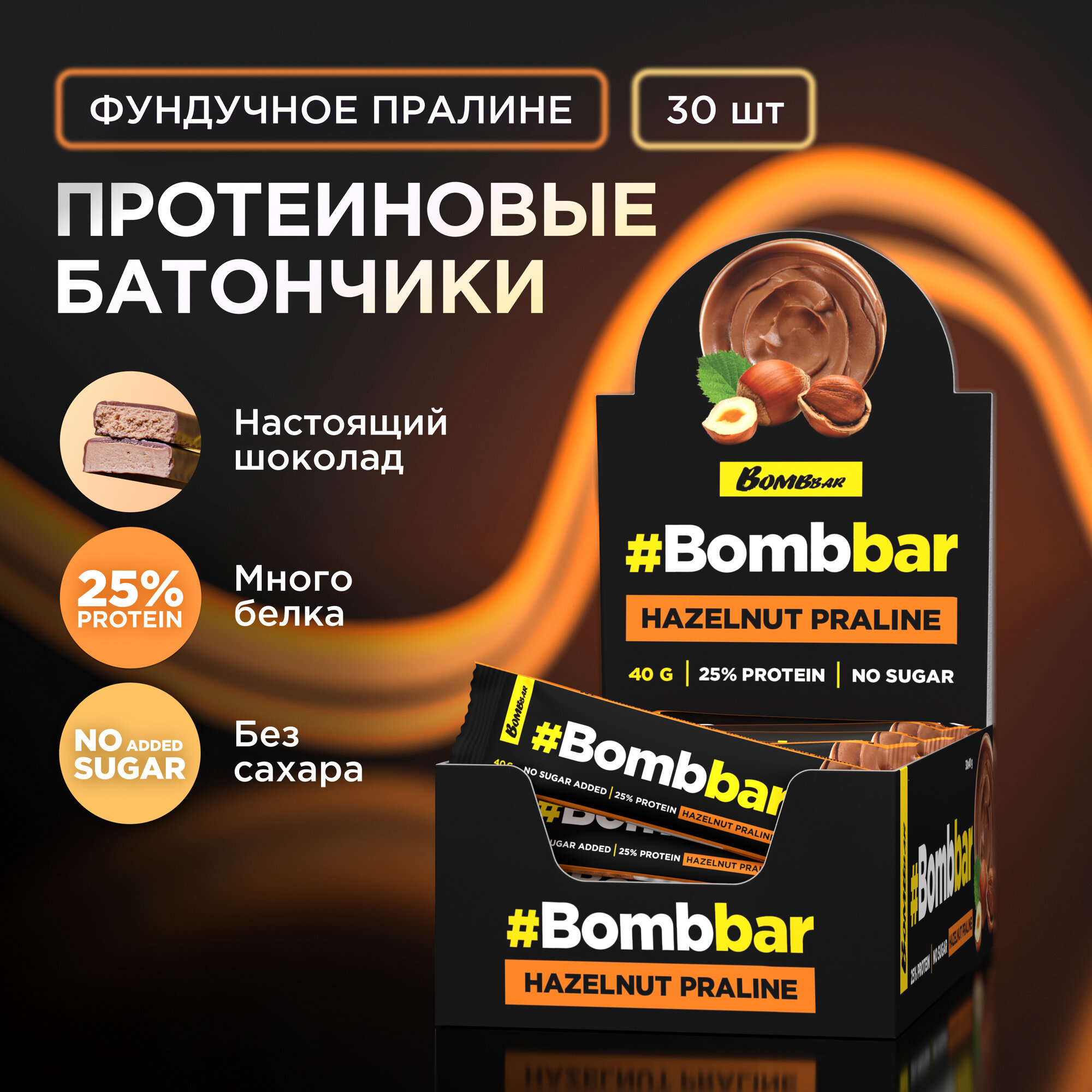 Протеиновые батончики Bombbar в шоколаде без сахара "Фундук Пралине", 30шт х 40г
