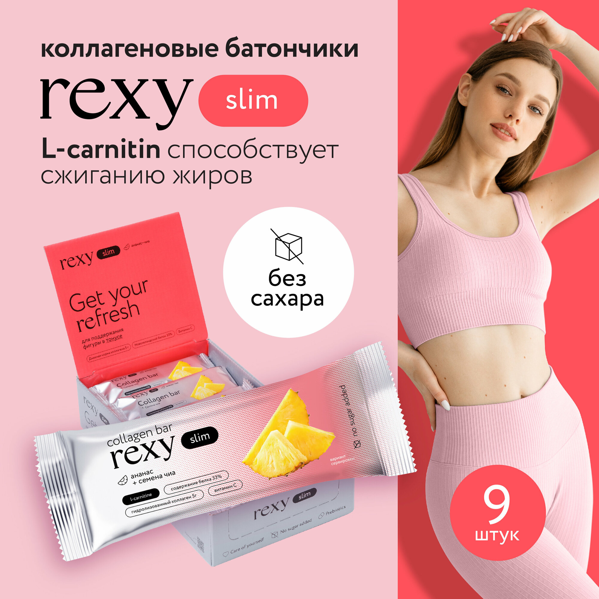 Протеиновые батончики rexy с коллагеном Ананас-чиа, 40г х 9шт, 140ккал без сахара ПП сладости, низкокалорийные спортивные батончики десерты ProteinRex