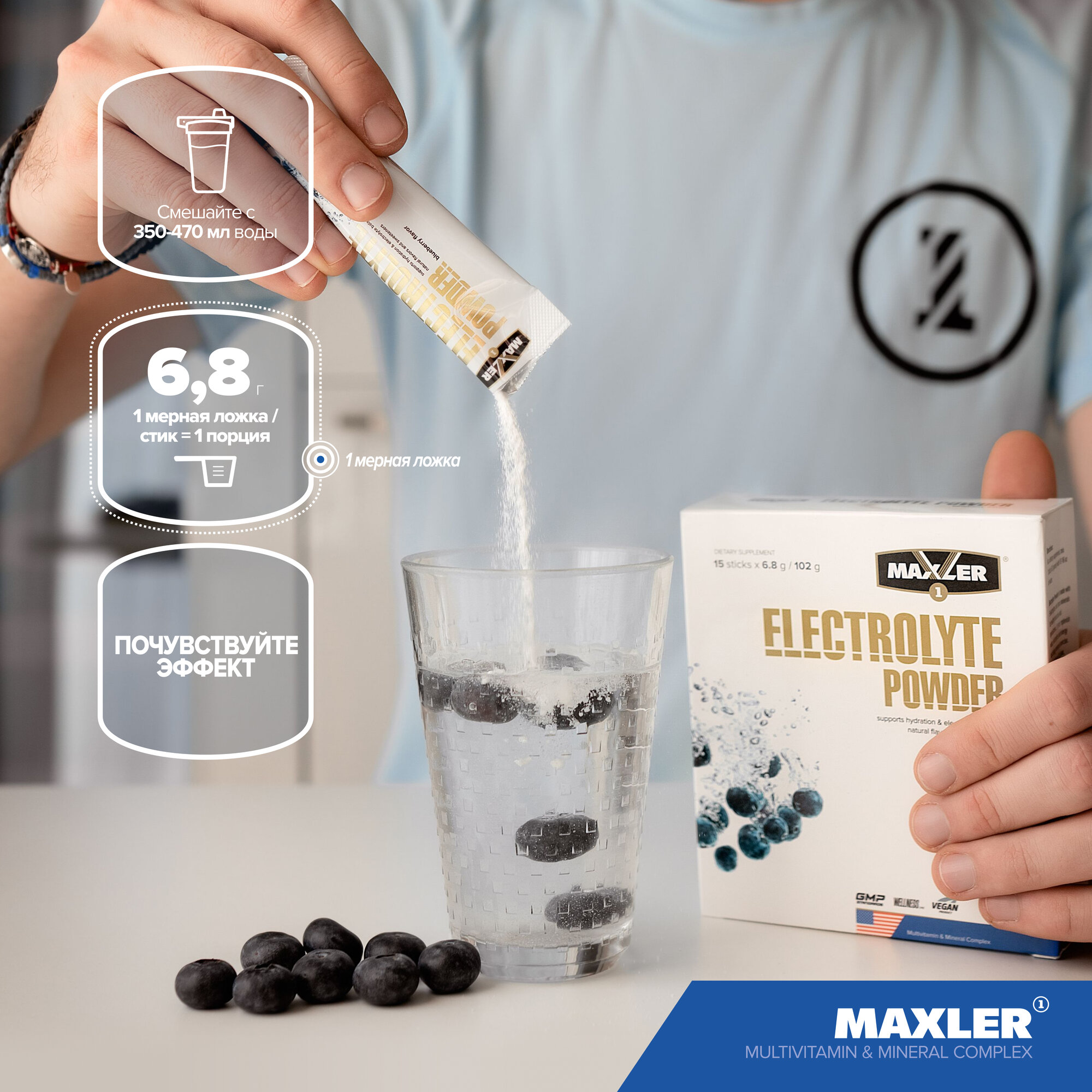 Электролиты Maxler Electrolyte Powder - Черника, 15х6,8 г - Поддержка электролитного баланс - Комплекс микроэлементов