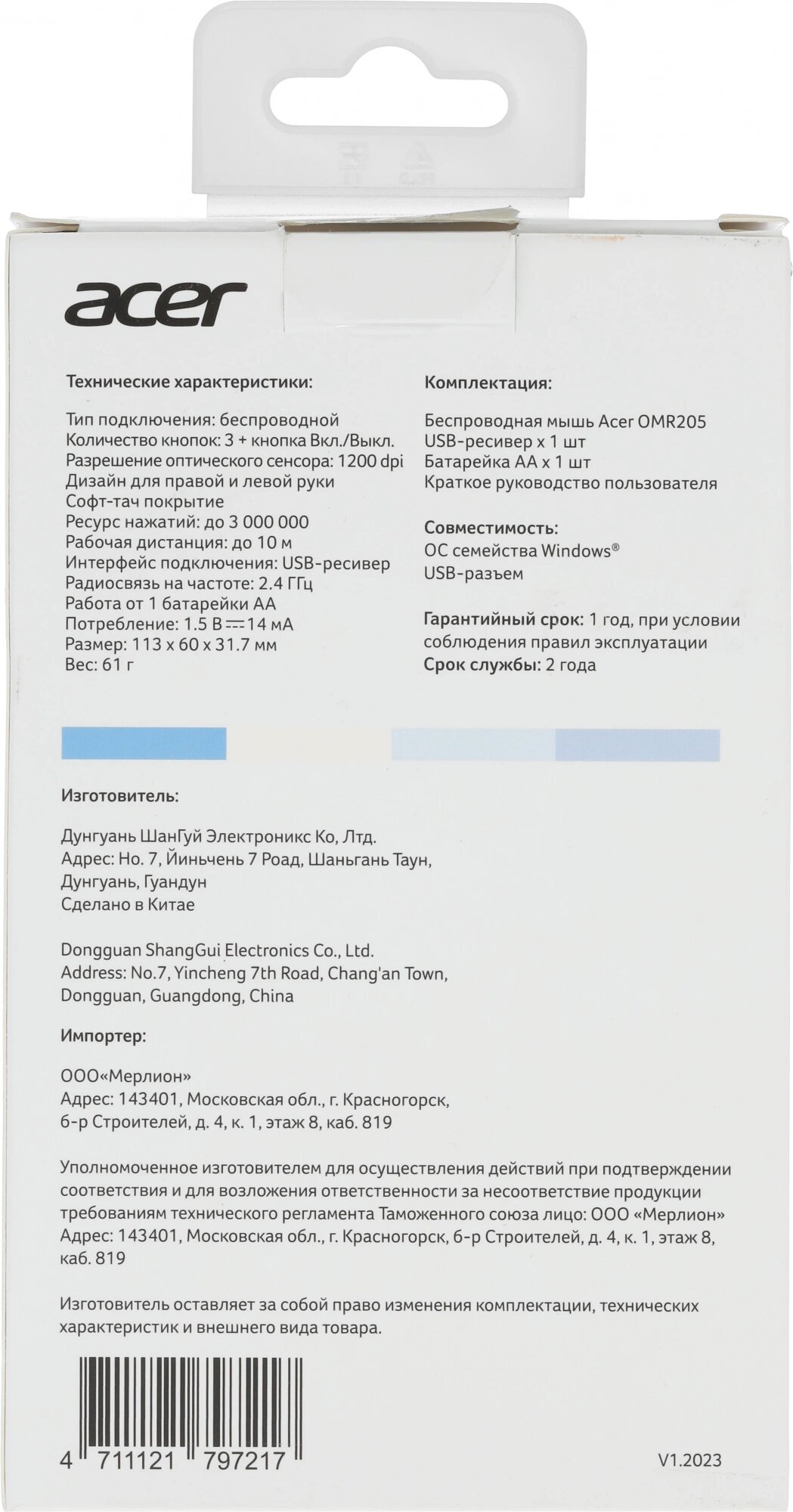 Компьютерная мышь Acer Бело-голубая, OMR205, 1200 dpi, беспроводная, USB (ZL.MCEEE.02H)