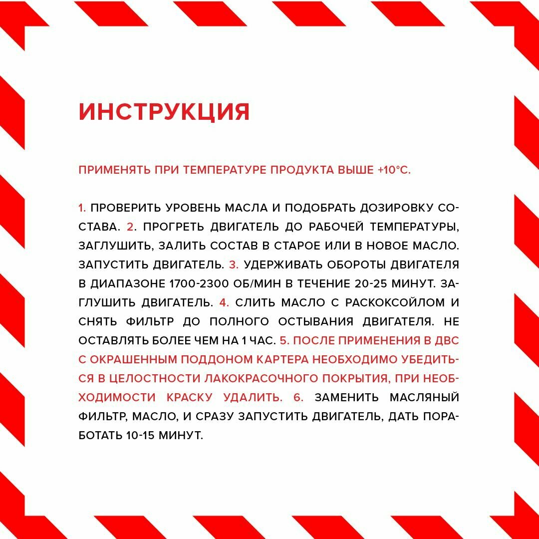 | Способ применения | перед применением выдержать состав при комнатной температуре в течении 6 часов; проверить уровень масла и правильно подобрать дозировку состава; флакон 100 мл рассчитан на 4-5 литров масла; при ином количестве масла дозировка не более 25 мл на 1 литр; прогреть двигатель до рабочей температуры, заглушить, открыть маслозаливную горловину; залить состав в рекомендуемой дозировке в старое масло или в новое, промывочное масло; для эффективной очистки сильнозагрязненных ДВС необходимо удерживать обороты двигателя в диапазоне 1700-2300 об/мин в течение 20-25 минут; заглушить двигатель и дать остыть для безопасного слива отработанного масла; после применения в ДВС с окрашенным поддоном картера необходимо убедиться в целостности лакокрасочного покрытия, при необходимости краску удалить; заменить масляный фильтр и масло |