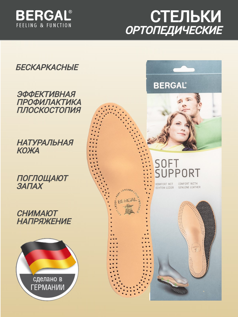 Стельки BERGAL SOFT SUPPORT размер 41 для предотвращения плоскостопия, анатомические кожа бескаркасные