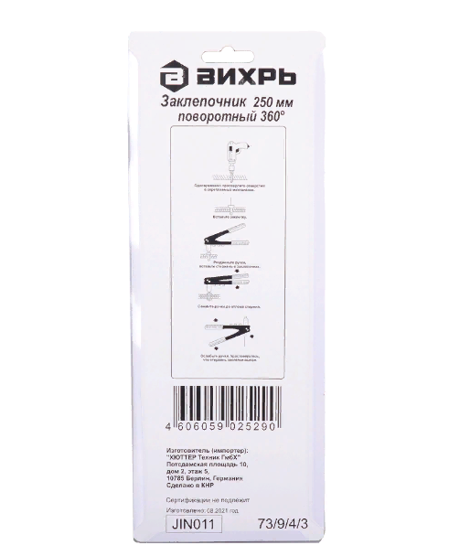 | Дополнительная информация | Заклепочник Вихрь поворотный 360 градусов 250 мм. Max скрепляемая толщина 45 мм. |