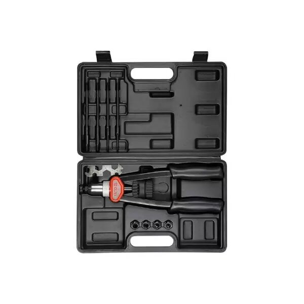 | Подробная комплектация | Кейс Заклепочник Тяговый стержень Ключ Насадки М5, М6, М8, М10, М12. |