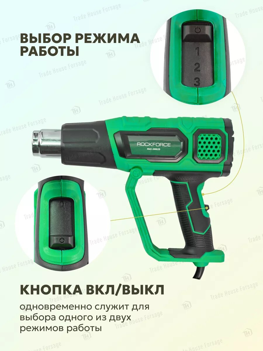 Фен промышленный RF-HG65-2000LED с насадками (220В,5060Гц,2000Вт, 60350600С°, 50300500лмин,3 режима, ROCK FORCE RFHG652000LED (1 шт.)