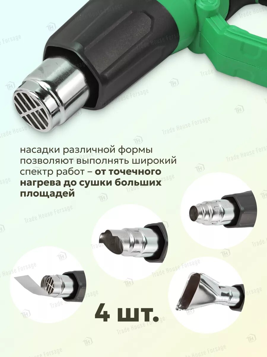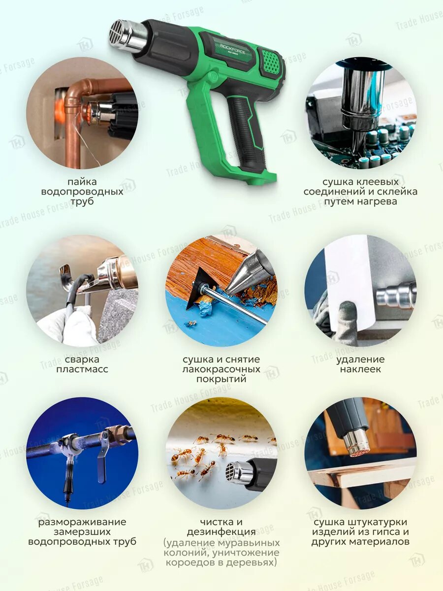 Купить Фен промышленный Rock Force с насадками, 220В, 50/60Гц, 2000Вт, 60/350/600С°, 50/300/500л/мин, 3 режима