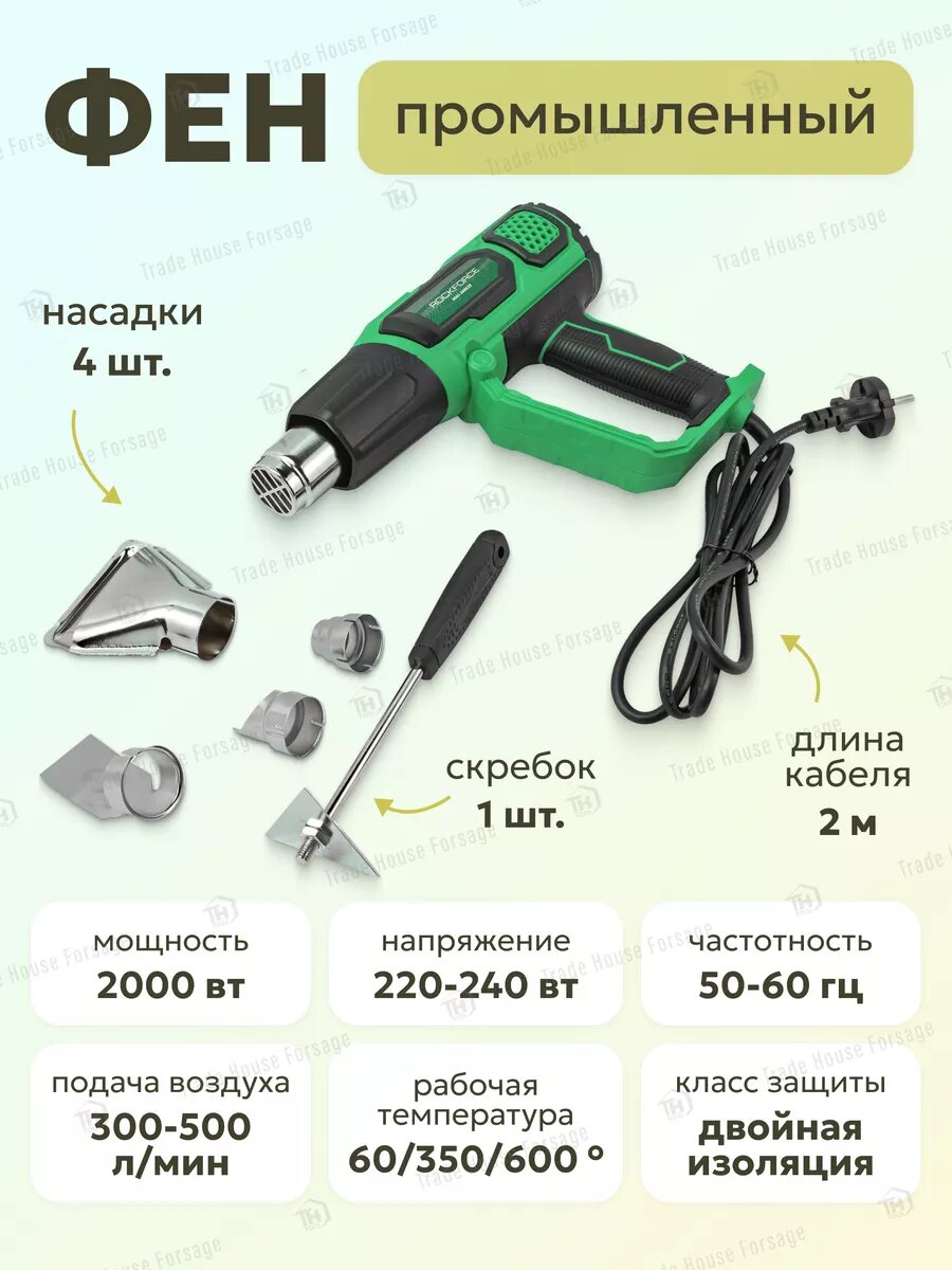 СохранитьФен промышленный Rock Force с насадками, 220В, 50/60Гц, 2000Вт, 60/350/600С°, 50/300/500л/мин, 3 режима интересное: