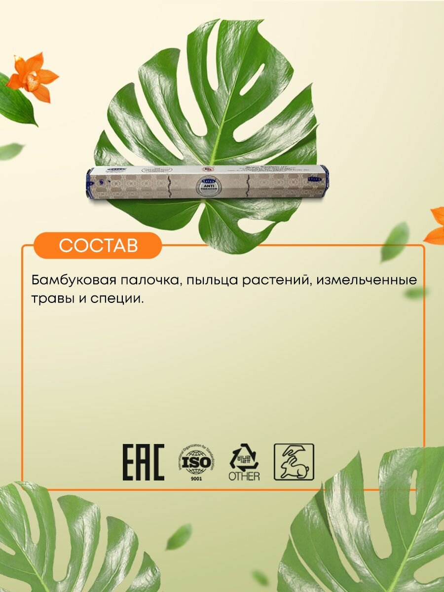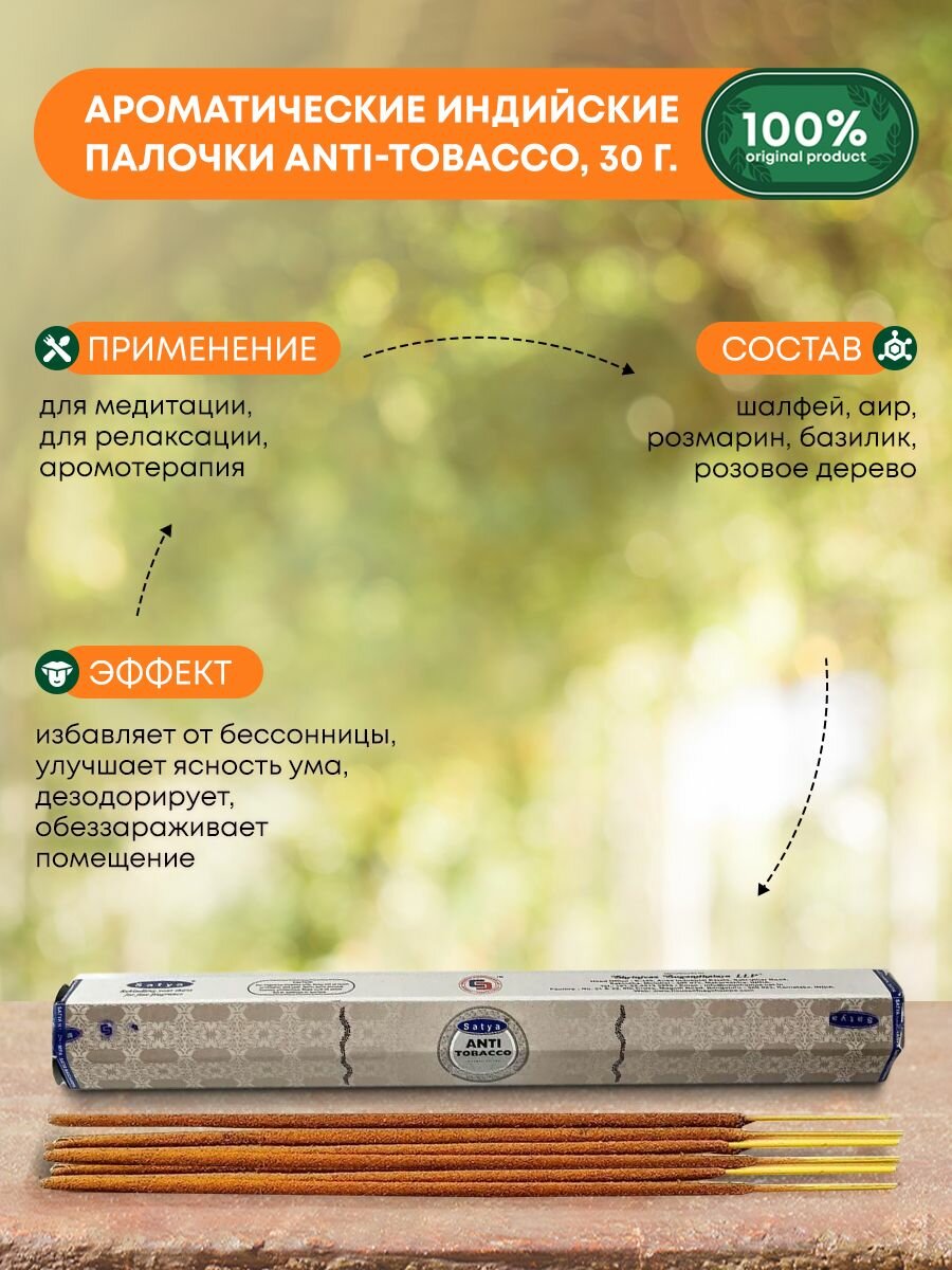 Купить Благовония Anti-Tobacco (Антитабак) Ароматические индийские палочки для дома, йоги и медитации, Satya Hexa Premium (Сатья Гекса Премиум), 30г