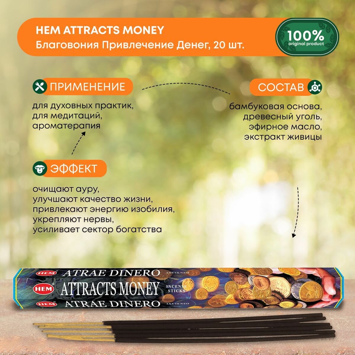 Купить Благовония Индийские ароматические палочки для дома, йоги и ароматерапии для привлечения денег (Attracts money incense sticks) HEM ХЭМ, 20шт