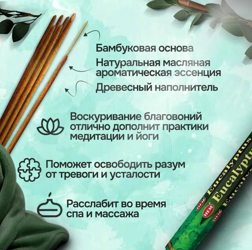 Натуральные индийские благовония HEM Эвкалипт (Eucalyptus), ароматические палочки 20 шт.