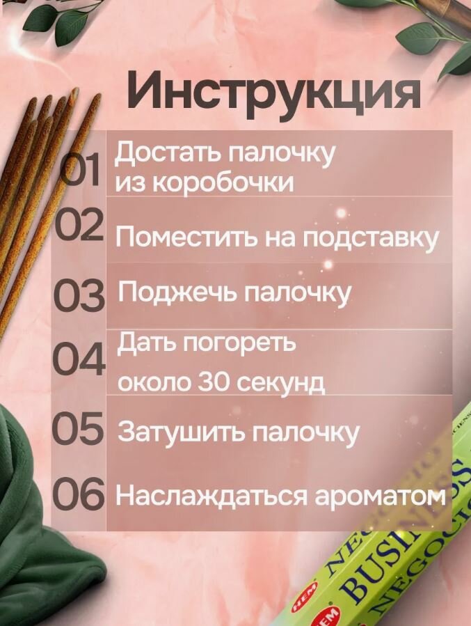 | Комплектация | Палочки ароматические 6 упаковок по 20 штук |