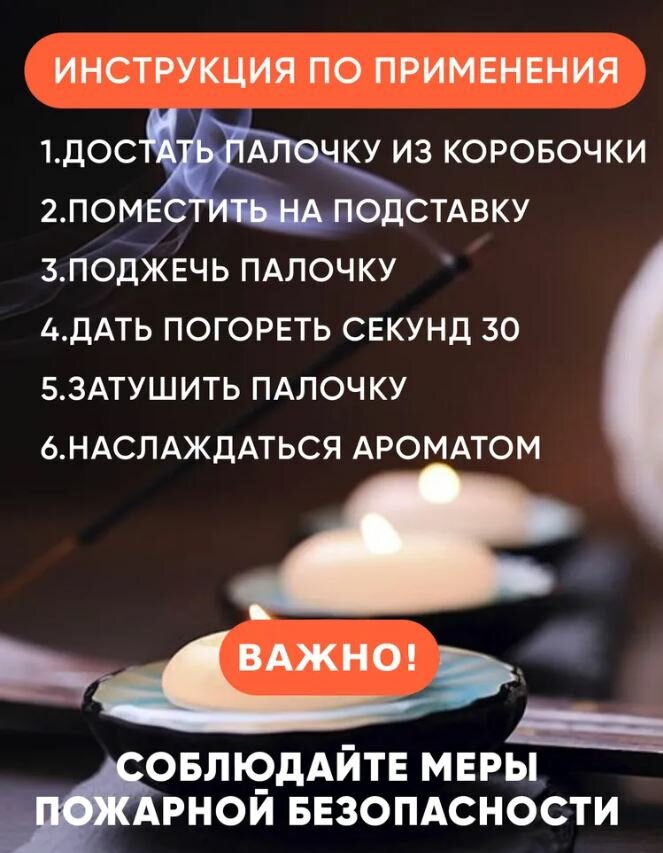 | Дополнительная информация | Воскуривание благовоний – настоящее искусство. Соблюдение всех нюансов позволит не только насладиться приятным ароматом, но и извлечь из этого пользу: - установите ароматическую палочку на специальную подставку (это аксессуар, защищающий мебель от пепла и произвольного возгорания, благодаря чему вы сможете спокойно насладиться сеансом ароматерапии); - зажгите изделие (убедитесь, что появилось небольшое пламя); - затем, после 5-10 секунд потушите его и оставьте тлеть (кончик благовония должен быть красного цвета); - чтобы полностью погасить ароматическую палочку, нужно тлеющим концом воткнуть ее в песок или землю в цветочном горшке. |